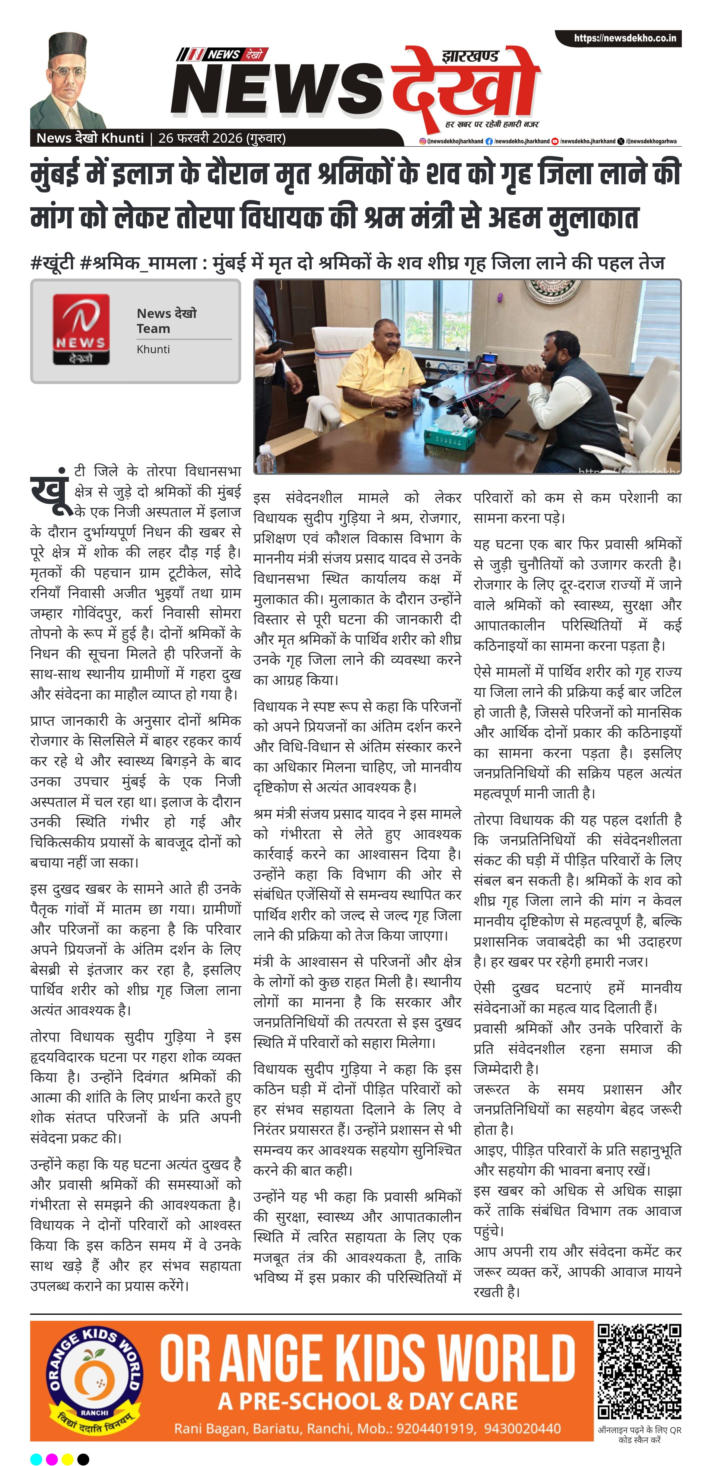 खूंटी जिले के तोरपा विधानसभा क्षेत्र के दो श्रमिकों की मुंबई में इलाज के दौरान मृत्यु के बाद क्षेत्र में शोक का माहौल है। इस संवेदनशील मामले को लेकर तोरपा विधायक सुदीप गुड़िया ने श्रम मंत्री से मुलाकात कर पार्थिव शरीर को शीघ्र गृह जिला लाने की मांग की है, जिससे परिजनों को अंतिम संस्कार का अवसर मिल सके।