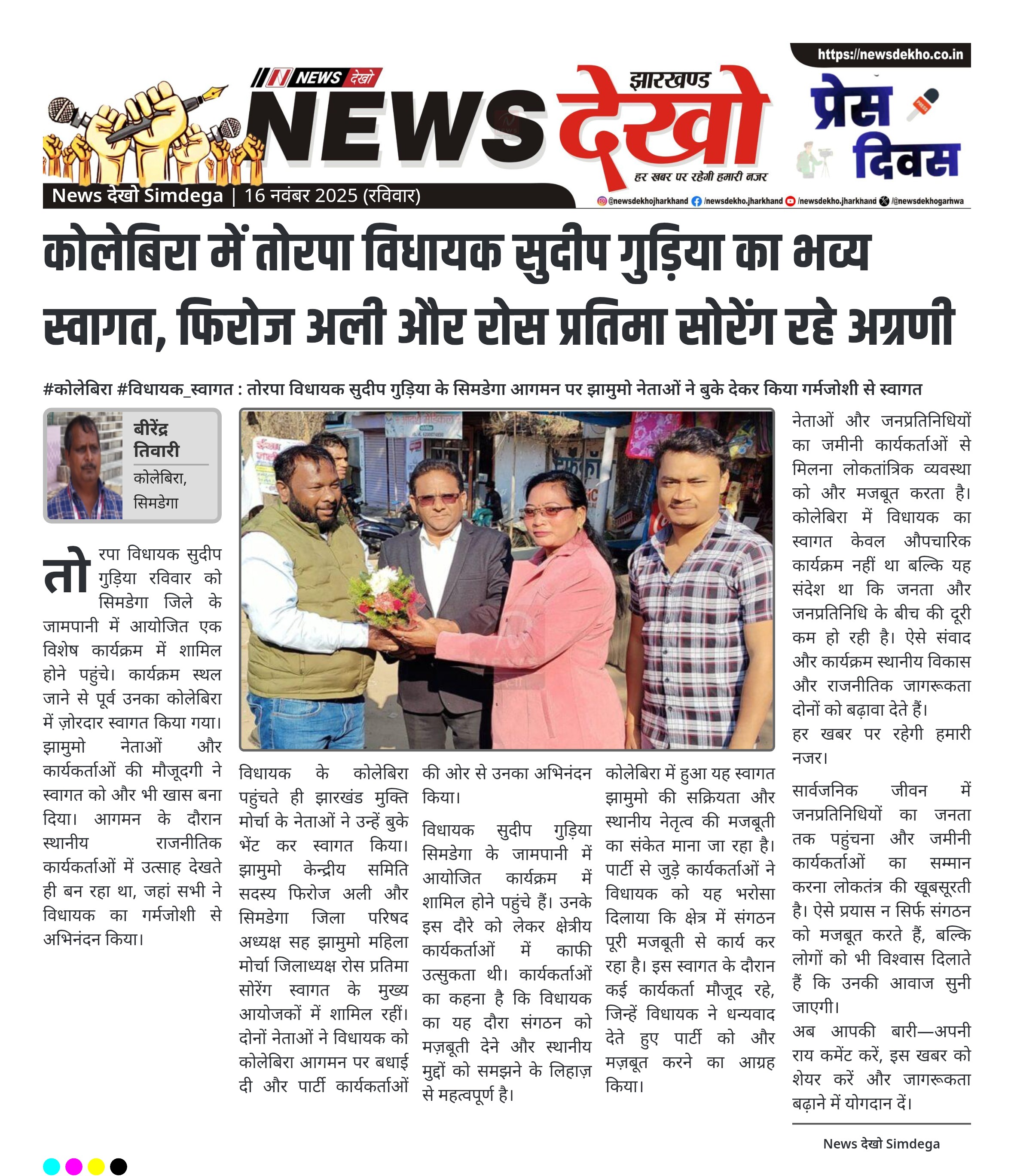 कोलेबिरा में हुआ यह स्वागत झामुमो की सक्रियता और स्थानीय नेतृत्व की मजबूती का संकेत माना जा रहा है। पार्टी से जुड़े कार्यकर्ताओं ने विधायक को यह भरोसा दिलाया कि क्षेत्र में संगठन पूरी मजबूती से कार्य कर रहा है। इस स्वागत के दौरान कई कार्यकर्ता मौजूद रहे, जिन्हें विधायक ने धन्यवाद देते हुए पार्टी को और मज़बूत करने का आग्रह किया।