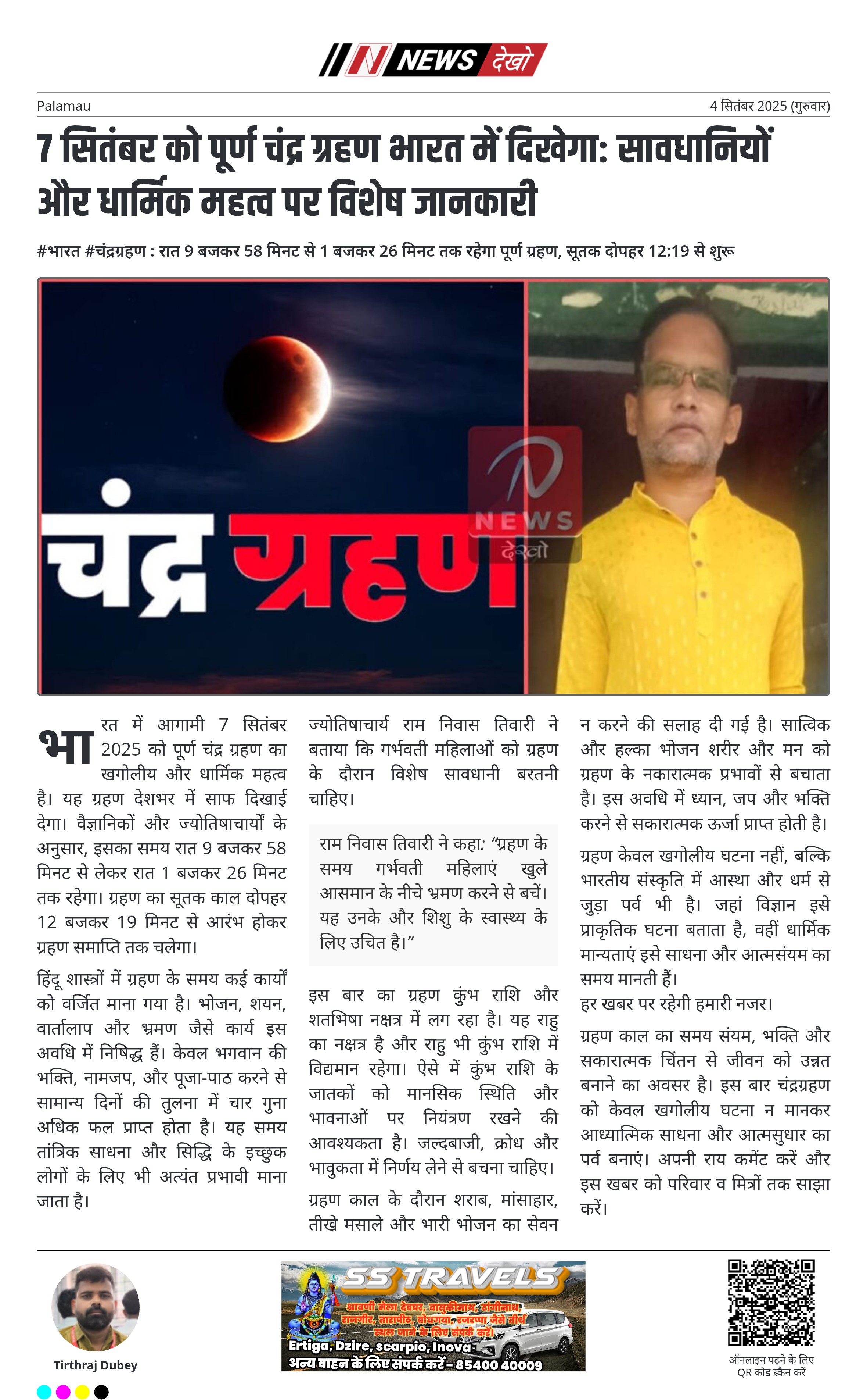 राम निवास तिवारी ने कहा: “ग्रहण के समय गर्भवती महिलाएं खुले आसमान के नीचे भ्रमण करने से बचें। यह उनके और शिशु के स्वास्थ्य के लिए उचित है।”