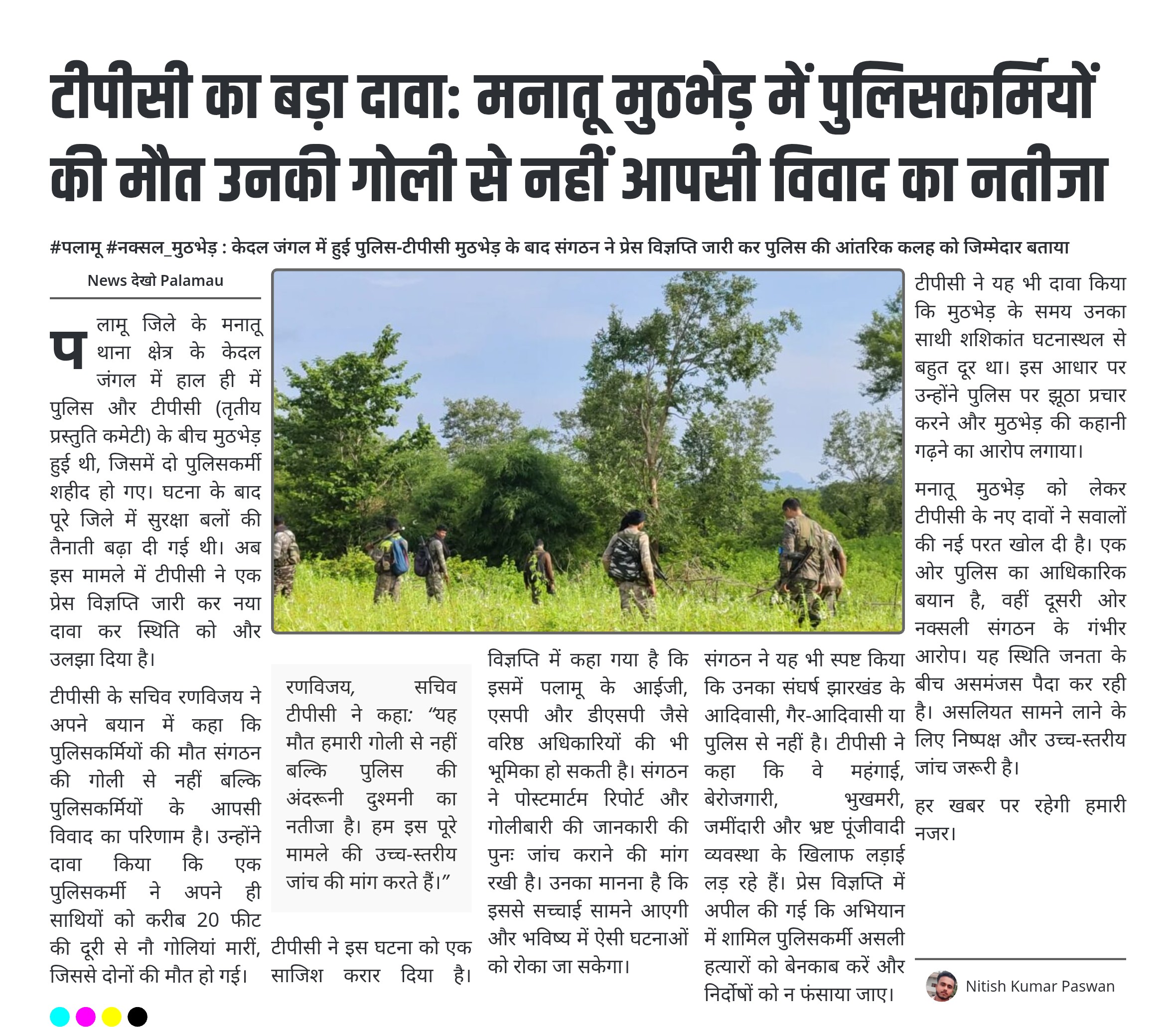 #पलामू #नक्सल_मुठभेड़ : केदल जंगल में हुई पुलिस-टीपीसी मुठभेड़ के बाद संगठन ने प्रेस विज्ञप्ति जारी कर पुलिस की आंतरिक कलह को जिम्मेदार बताया