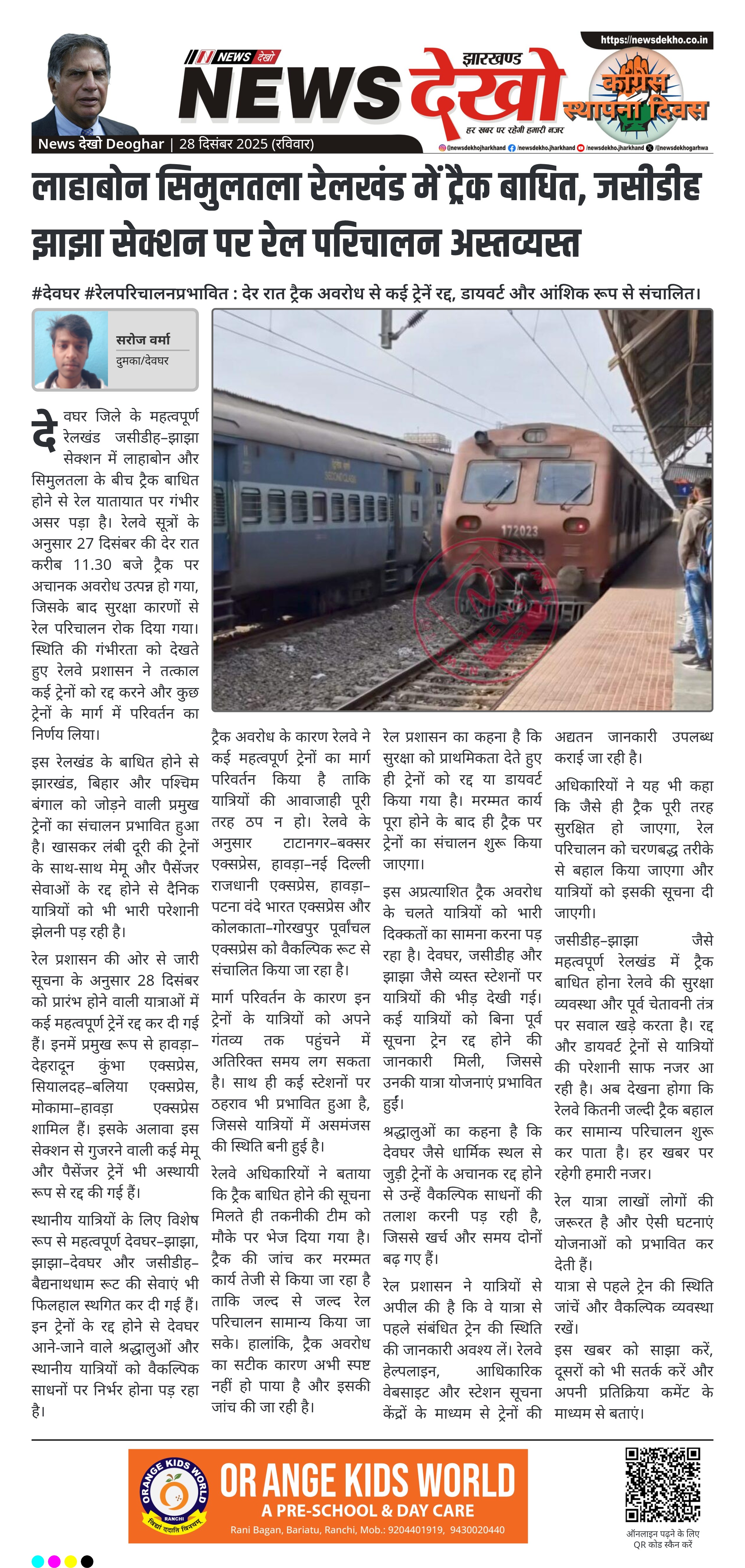 देवघर जिले के महत्वपूर्ण रेलखंड जसीडीह–झाझा सेक्शन में लाहाबोन और सिमुलतला के बीच ट्रैक बाधित होने से रेल यातायात पर गंभीर असर पड़ा है। रेलवे सूत्रों के अनुसार 27 दिसंबर की देर रात करीब 11.30 बजे ट्रैक पर अचानक अवरोध उत्पन्न हो गया, जिसके बाद सुरक्षा कारणों से रेल परिचालन रोक दिया गया। स्थिति की गंभीरता को देखते हुए रेलवे प्रशासन ने तत्काल कई ट्रेनों को रद्द करने और कुछ ट्रेनों के मार्ग में परिवर्तन का निर्णय लिया।