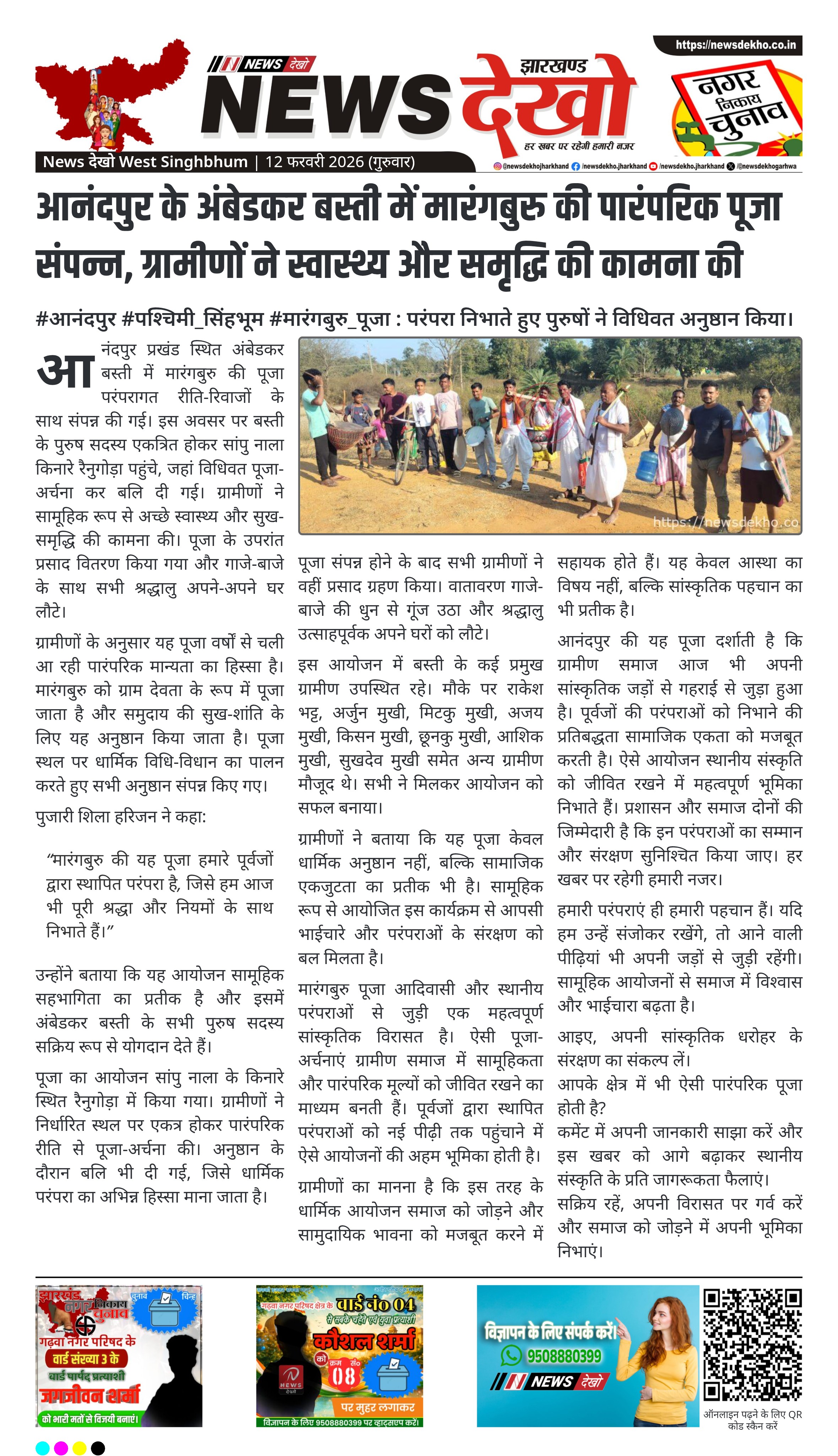 आनंदपुर प्रखंड स्थित अंबेडकर बस्ती में मारंगबुरु की पूजा परंपरागत रीति-रिवाजों के साथ संपन्न की गई। इस अवसर पर बस्ती के पुरुष सदस्य एकत्रित होकर सांपु नाला किनारे रैनुगोड़ा पहुंचे, जहां विधिवत पूजा-अर्चना कर बलि दी गई। ग्रामीणों ने सामूहिक रूप से अच्छे स्वास्थ्य और सुख-समृद्धि की कामना की। पूजा के उपरांत प्रसाद वितरण किया गया और गाजे-बाजे के साथ सभी श्रद्धालु अपने-अपने घर लौटे।