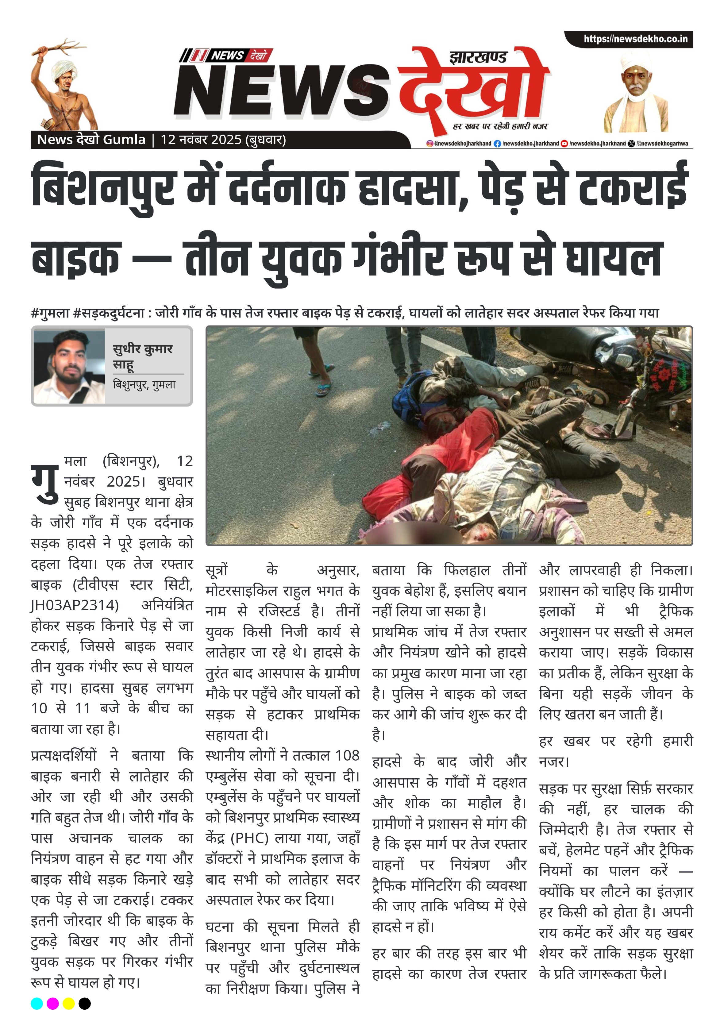 गुमला (बिशनपुर), 12 नवंबर 2025। बुधवार सुबह बिशनपुर थाना क्षेत्र के जोरी गाँव में एक दर्दनाक सड़क हादसे ने पूरे इलाके को दहला दिया। एक तेज रफ्तार बाइक (टीवीएस स्टार सिटी, JH03AP2314) अनियंत्रित होकर सड़क किनारे पेड़ से जा टकराई, जिससे बाइक सवार तीन युवक गंभीर रूप से घायल हो गए। हादसा सुबह लगभग 10 से 11 बजे के बीच का बताया जा रहा है।