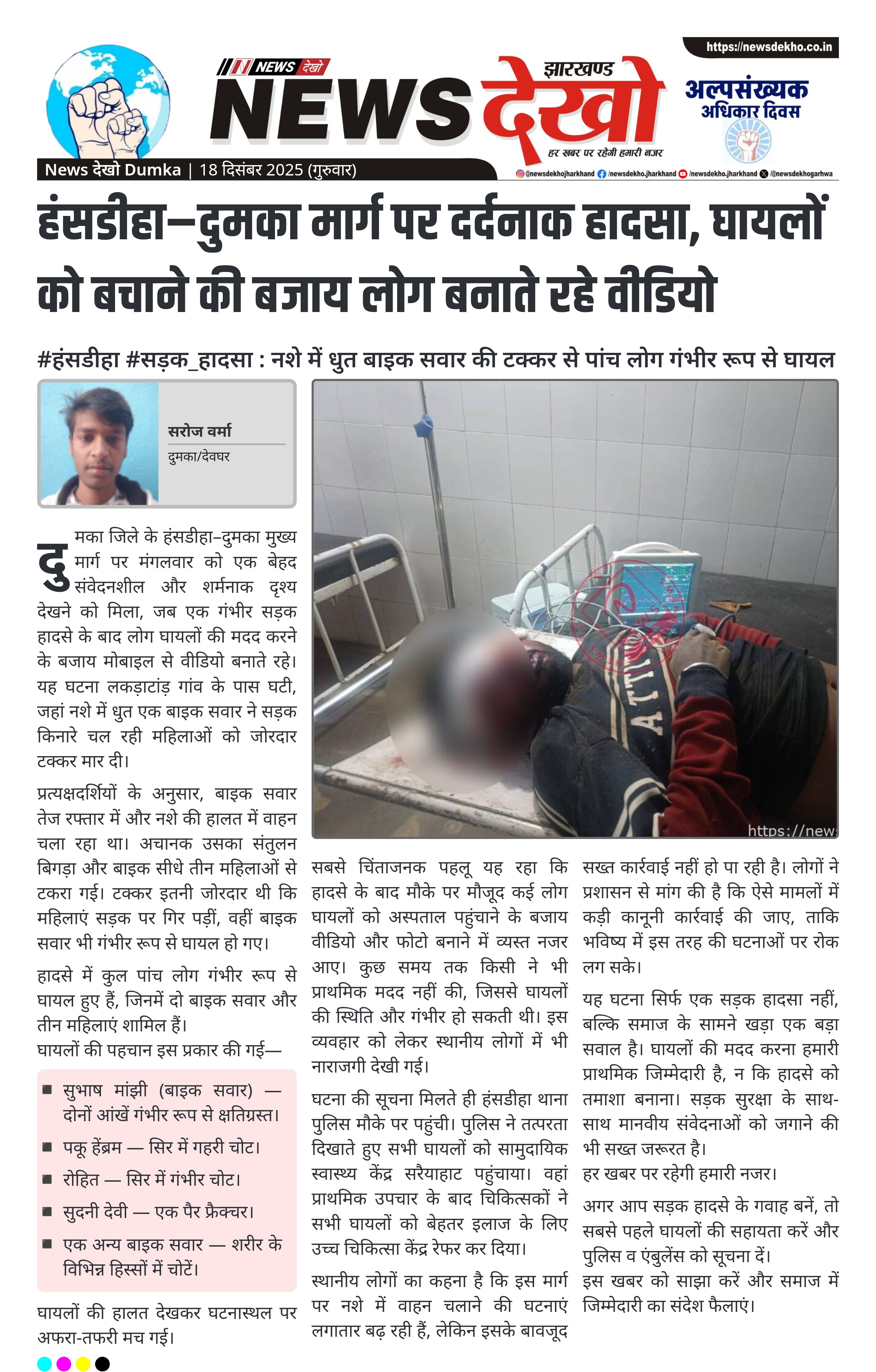 दुमका जिले के हंसडीहा–दुमका मुख्य मार्ग पर मंगलवार को एक बेहद संवेदनशील और शर्मनाक दृश्य देखने को मिला, जब एक गंभीर सड़क हादसे के बाद लोग घायलों की मदद करने के बजाय मोबाइल से वीडियो बनाते रहे। यह घटना लकड़ाटांड़ गांव के पास घटी, जहां नशे में धुत एक बाइक सवार ने सड़क किनारे चल रही महिलाओं को जोरदार टक्कर मार दी।