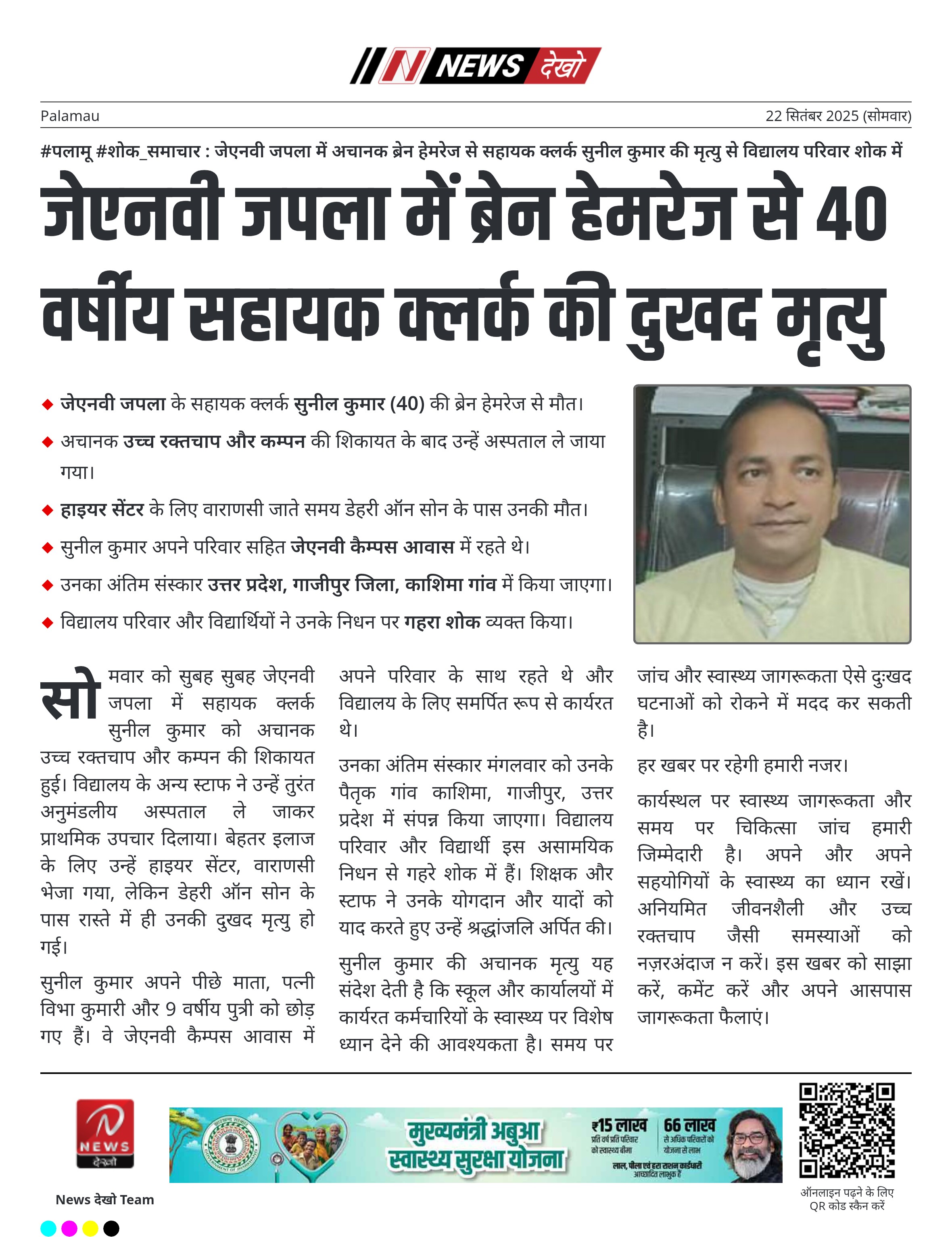 - जेएनवी जपला के सहायक क्लर्क सुनील कुमार (40) की ब्रेन हेमरेज से मौत।