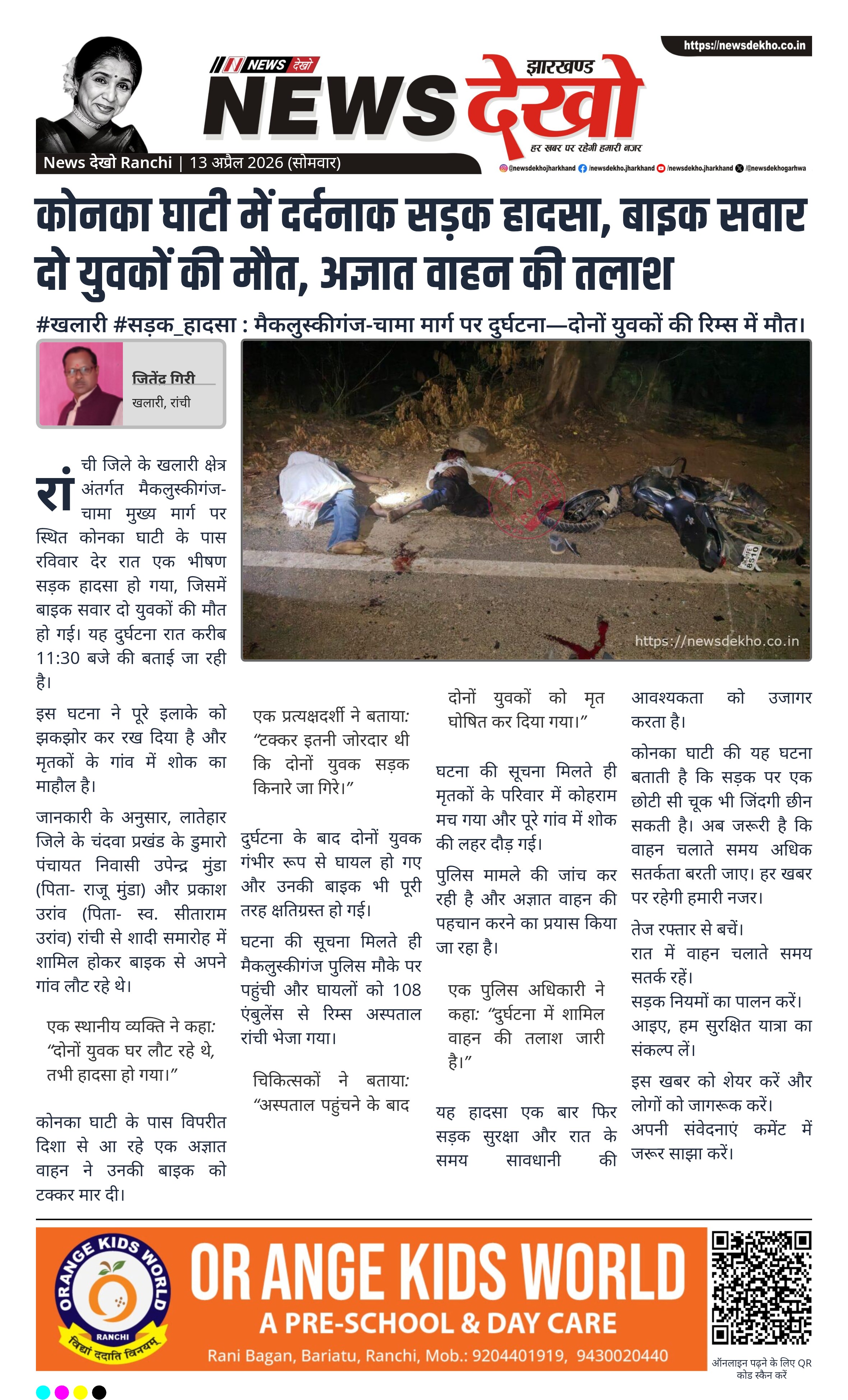 रांची जिले के खलारी क्षेत्र अंतर्गत मैकलुस्कीगंज-चामा मुख्य मार्ग पर स्थित कोनका घाटी के पास रविवार देर रात एक भीषण सड़क हादसा हो गया, जिसमें बाइक सवार दो युवकों की मौत हो गई। यह दुर्घटना रात करीब 11:30 बजे की बताई जा रही है।