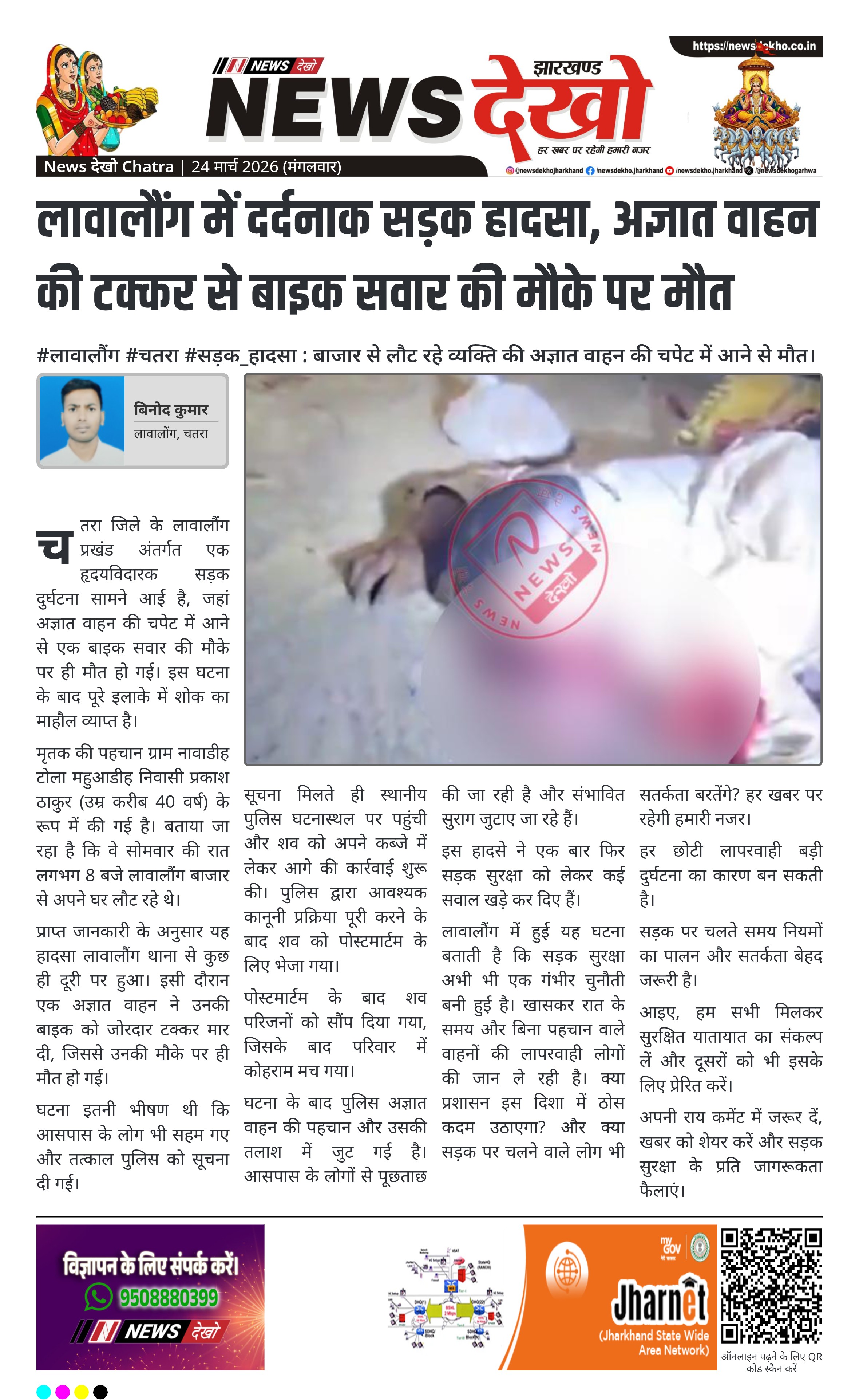 #लावालौंग #चतरा #सड़क_हादसा : बाजार से लौट रहे व्यक्ति की अज्ञात वाहन की चपेट में आने से मौत।