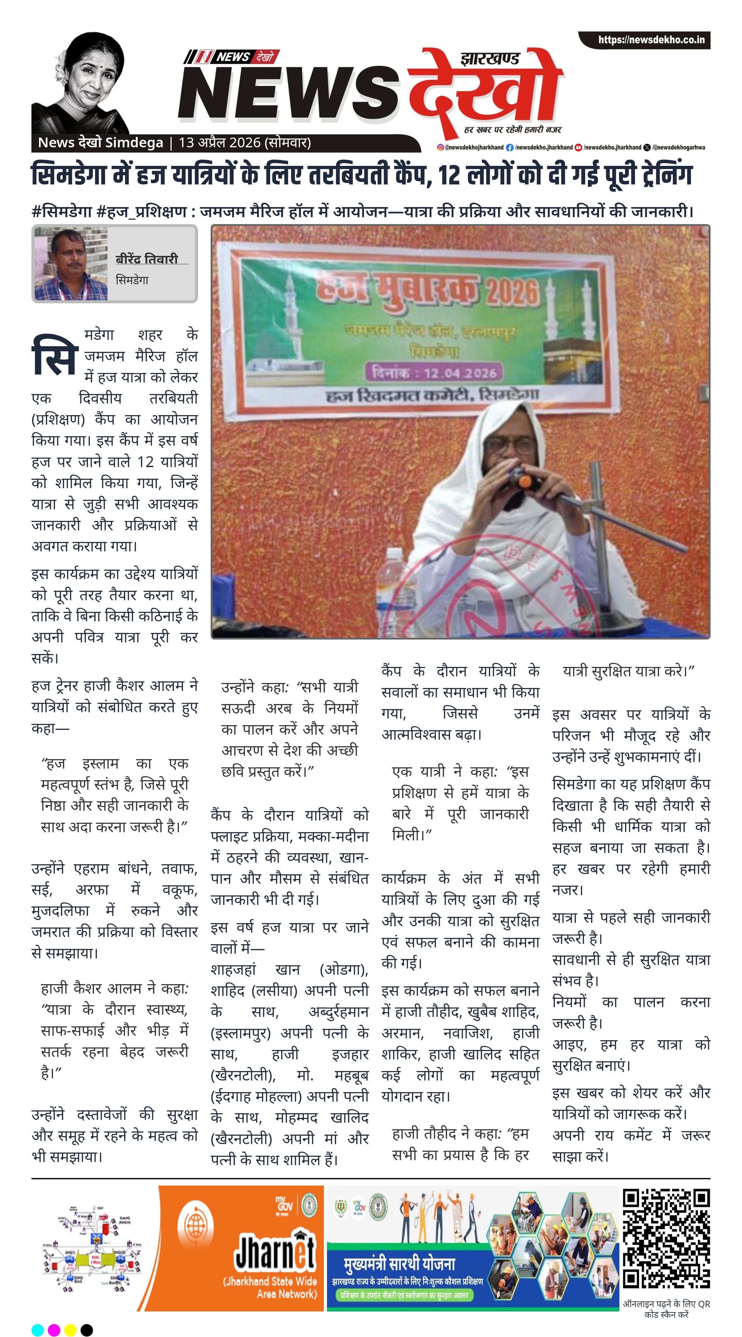 सिमडेगा में हज यात्रा को लेकर तरबियती कैंप आयोजित किया गया, जिसमें 12 यात्रियों को प्रशिक्षण दिया गया। हज की प्रक्रिया, नियम और सावधानियों की जानकारी दी गई। हाजी कैशर आलम ने यात्रियों को विस्तार से मार्गदर्शन दिया। कार्यक्रम में परिजन भी मौजूद रहे।