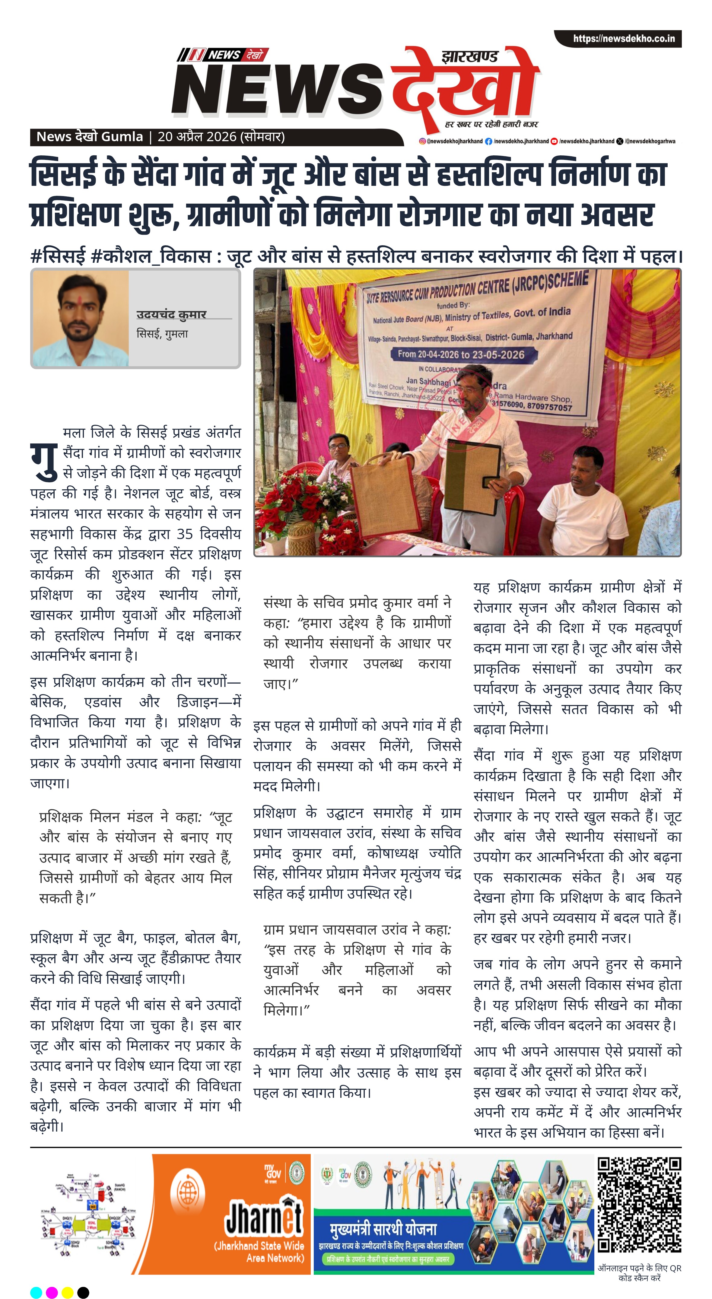 गुमला जिले के सिसई प्रखंड अंतर्गत सैंदा गांव में ग्रामीणों को स्वरोजगार से जोड़ने की दिशा में एक महत्वपूर्ण पहल की गई है। नेशनल जूट बोर्ड, वस्त्र मंत्रालय भारत सरकार के सहयोग से जन सहभागी विकास केंद्र द्वारा 35 दिवसीय जूट रिसोर्स कम प्रोडक्शन सेंटर प्रशिक्षण कार्यक्रम की शुरुआत की गई। इस प्रशिक्षण का उद्देश्य स्थानीय लोगों, खासकर ग्रामीण युवाओं और महिलाओं को हस्तशिल्प निर्माण में दक्ष बनाकर आत्मनिर्भर बनाना है।