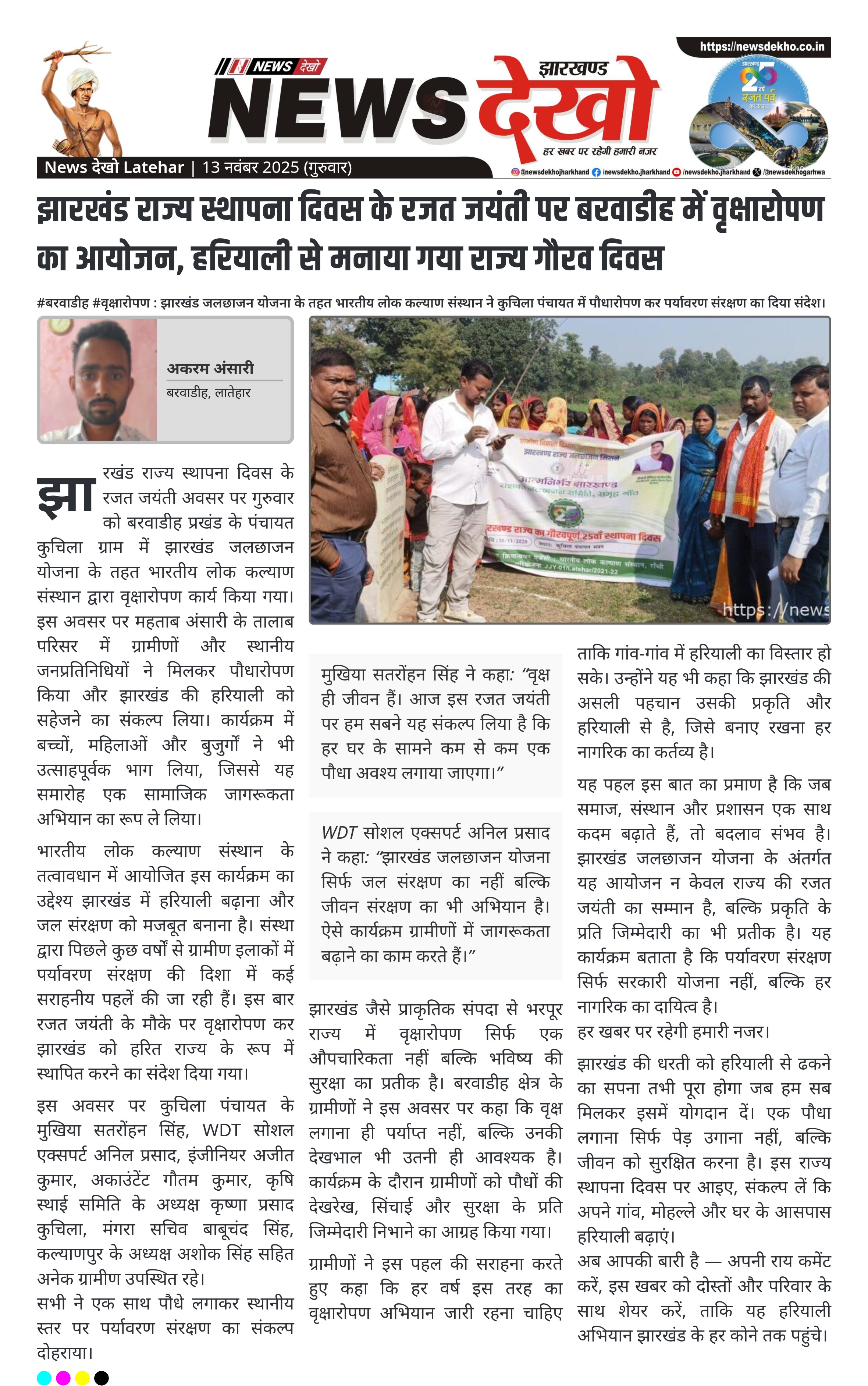 झारखंड राज्य स्थापना दिवस के रजत जयंती अवसर पर गुरुवार को बरवाडीह प्रखंड के पंचायत कुचिला ग्राम में झारखंड जलछाजन योजना के तहत भारतीय लोक कल्याण संस्थान द्वारा वृक्षारोपण कार्य किया गया। इस अवसर पर महताब अंसारी के तालाब परिसर में ग्रामीणों और स्थानीय जनप्रतिनिधियों ने मिलकर पौधारोपण किया और झारखंड की हरियाली को सहेजने का संकल्प लिया। कार्यक्रम में बच्चों, महिलाओं और बुजुर्गों ने भी उत्साहपूर्वक भाग लिया, जिससे यह समारोह एक सामाजिक जागरूकता अभियान का रूप ले लिया।