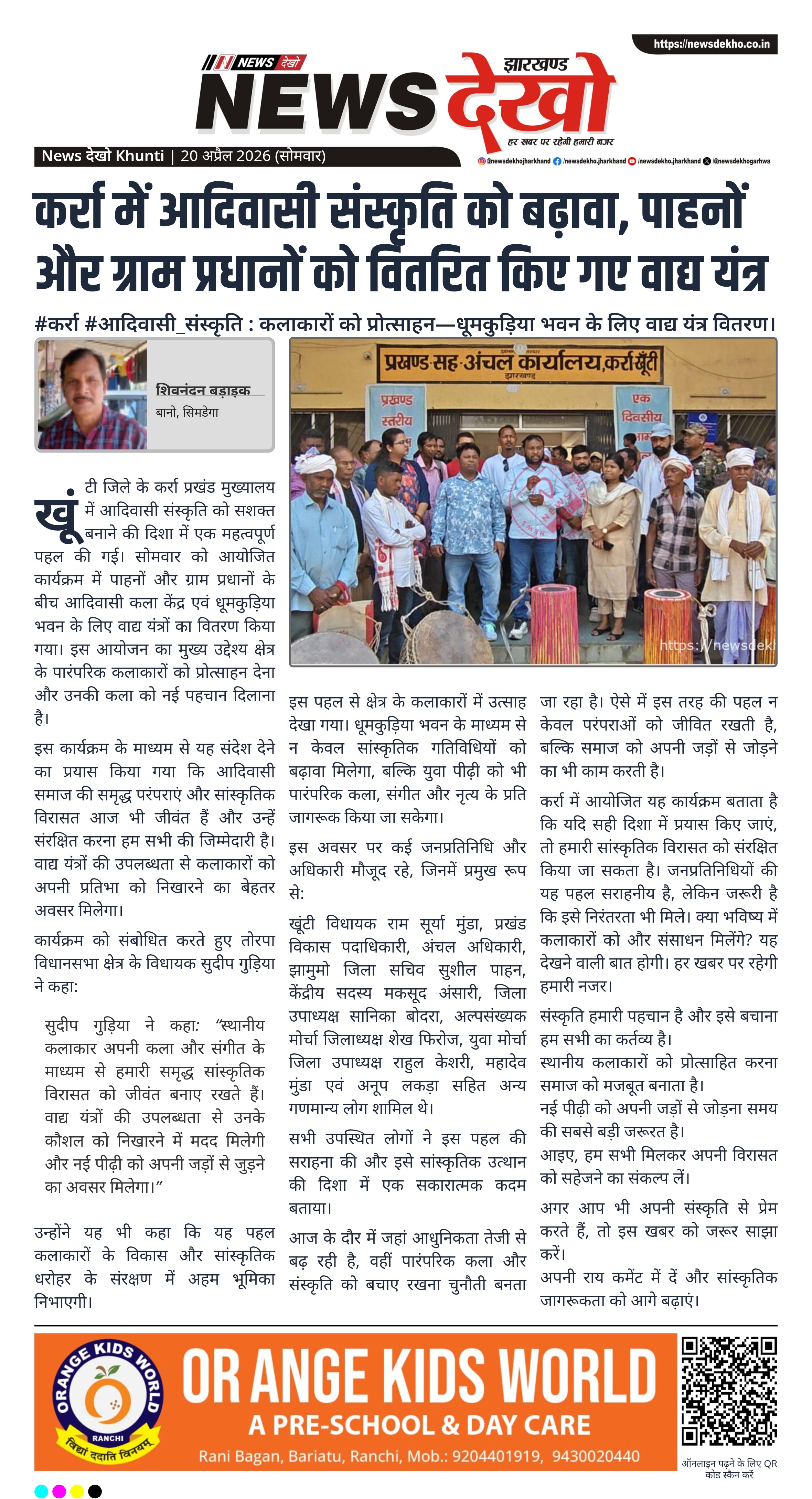 खूंटी जिले के कर्रा प्रखंड मुख्यालय में सोमवार को आदिवासी कला केंद्र और धूमकुड़िया भवन के लिए वाद्य यंत्रों का वितरण किया गया। इस कार्यक्रम में तोरपा विधायक सुदीप गुड़िया सहित कई जनप्रतिनिधि मौजूद रहे। पहल का उद्देश्य पारंपरिक कलाकारों को प्रोत्साहित करना और आदिवासी संस्कृति के संरक्षण को मजबूत बनाना है। इस दौरान स्थानीय कलाकारों के कौशल विकास और नई पीढ़ी को संस्कृति से जोड़ने पर जोर दिया गया।