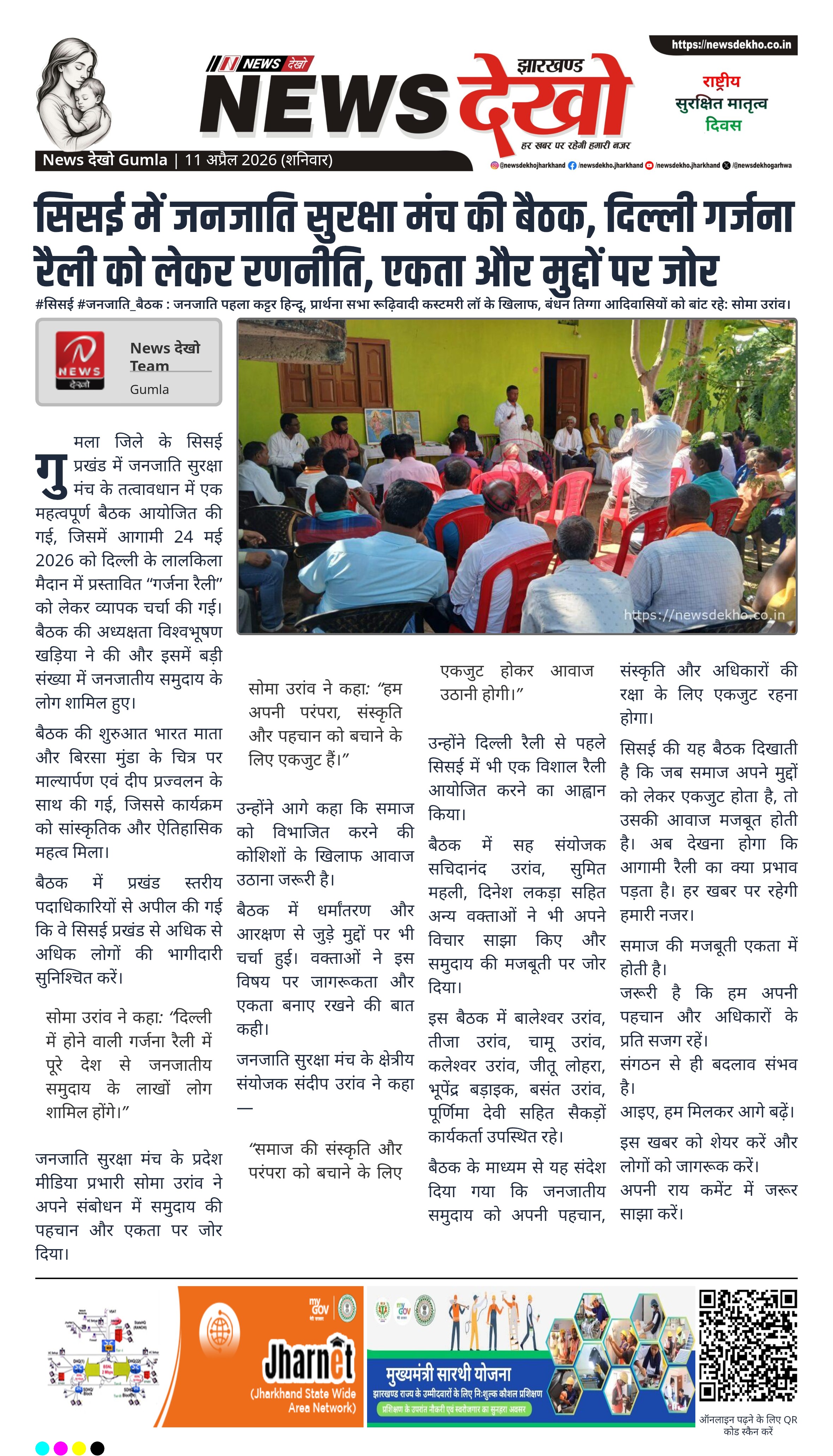 गुमला जिले के सिसई प्रखंड में जनजाति सुरक्षा मंच के तत्वावधान में एक महत्वपूर्ण बैठक आयोजित की गई, जिसमें आगामी 24 मई 2026 को दिल्ली के लालकिला मैदान में प्रस्तावित “गर्जना रैली” को लेकर व्यापक चर्चा की गई। बैठक की अध्यक्षता विश्वभूषण खड़िया ने की और इसमें बड़ी संख्या में जनजातीय समुदाय के लोग शामिल हुए।