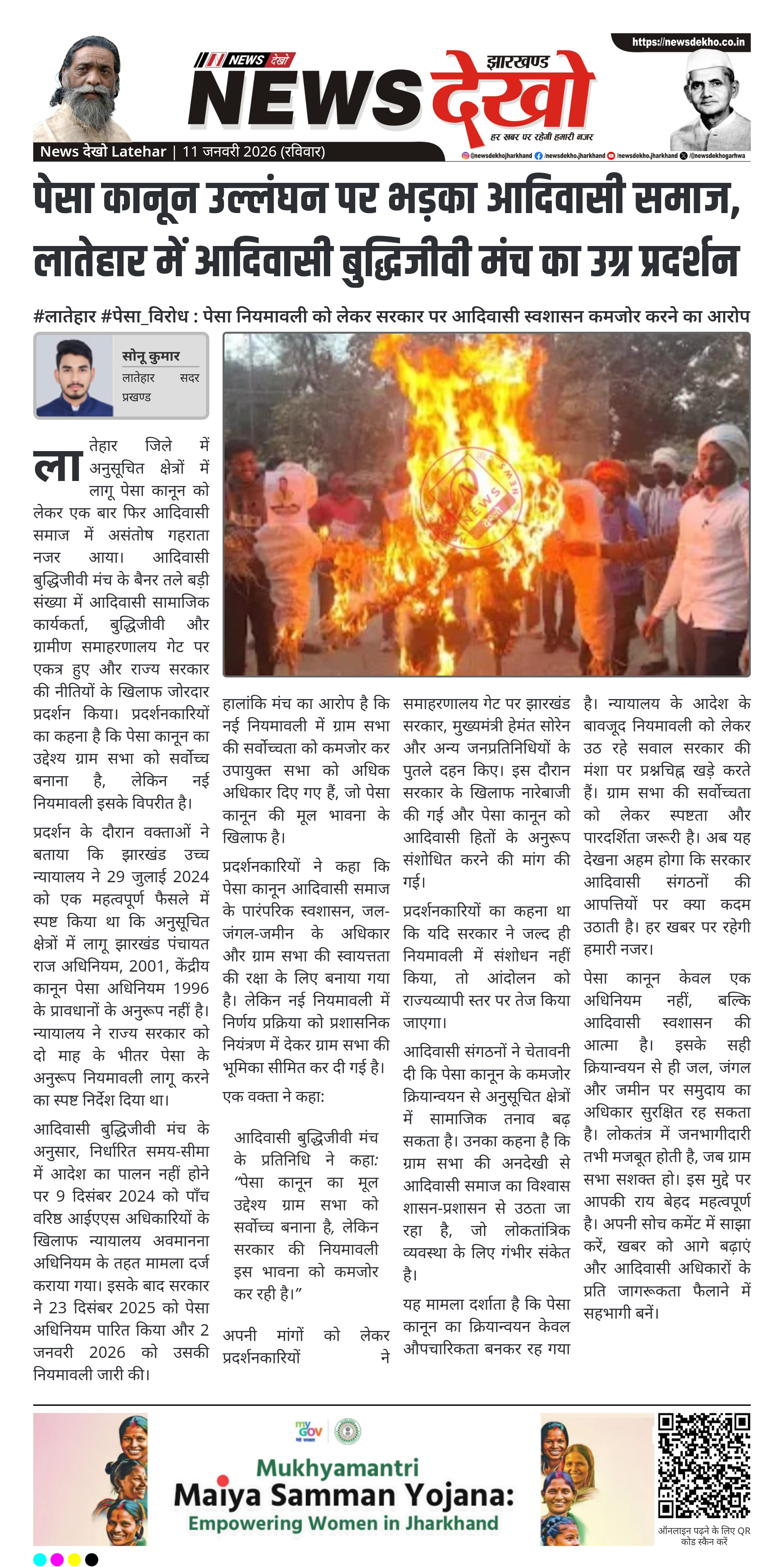 पेसा कानून केवल एक अधिनियम नहीं, बल्कि आदिवासी स्वशासन की आत्मा है। इसके सही क्रियान्वयन से ही जल, जंगल और जमीन पर समुदाय का अधिकार सुरक्षित रह सकता है। लोकतंत्र में जनभागीदारी तभी मजबूत होती है, जब ग्राम सभा सशक्त हो। इस मुद्दे पर आपकी राय बेहद महत्वपूर्ण है। अपनी सोच कमेंट में साझा करें, खबर को आगे बढ़ाएं और आदिवासी अधिकारों के प्रति जागरूकता फैलाने में सहभागी बनें।