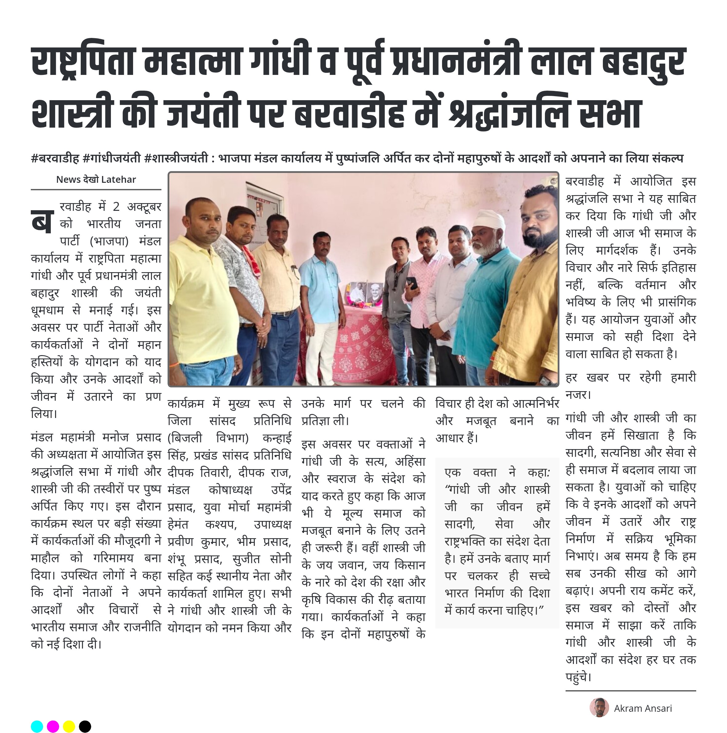 • भाजपा मंडल कार्यालय बरवाडीह में गांधी और शास्त्री जयंती मनाई गई।