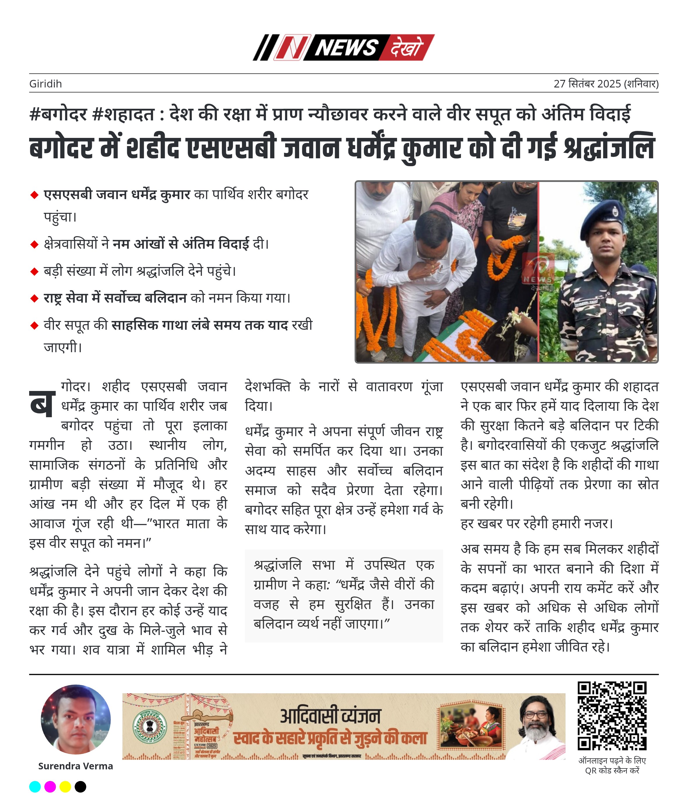 एसएसबी जवान धर्मेंद्र कुमार की शहादत ने एक बार फिर हमें याद दिलाया कि देश की सुरक्षा कितने बड़े बलिदान पर टिकी है। बगोदरवासियों की एकजुट श्रद्धांजलि इस बात का संदेश है कि शहीदों की गाथा आने वाली पीढ़ियों तक प्रेरणा का स्रोत बनी रहेगी।