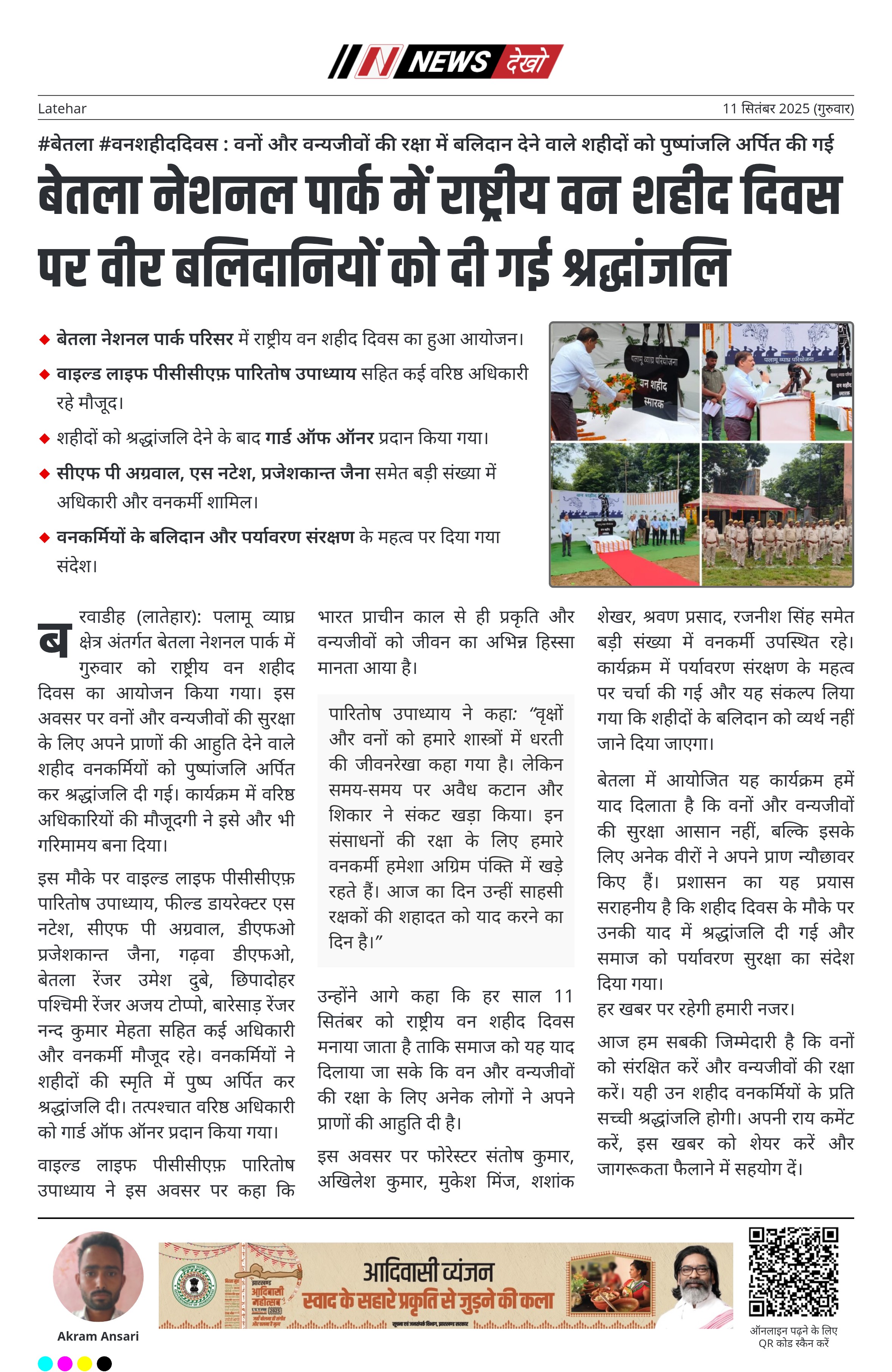 बेतला में आयोजित यह कार्यक्रम हमें याद दिलाता है कि वनों और वन्यजीवों की सुरक्षा आसान नहीं, बल्कि इसके लिए अनेक वीरों ने अपने प्राण न्यौछावर किए हैं। प्रशासन का यह प्रयास सराहनीय है कि शहीद दिवस के मौके पर उनकी याद में श्रद्धांजलि दी गई और समाज को पर्यावरण सुरक्षा का संदेश दिया गया।