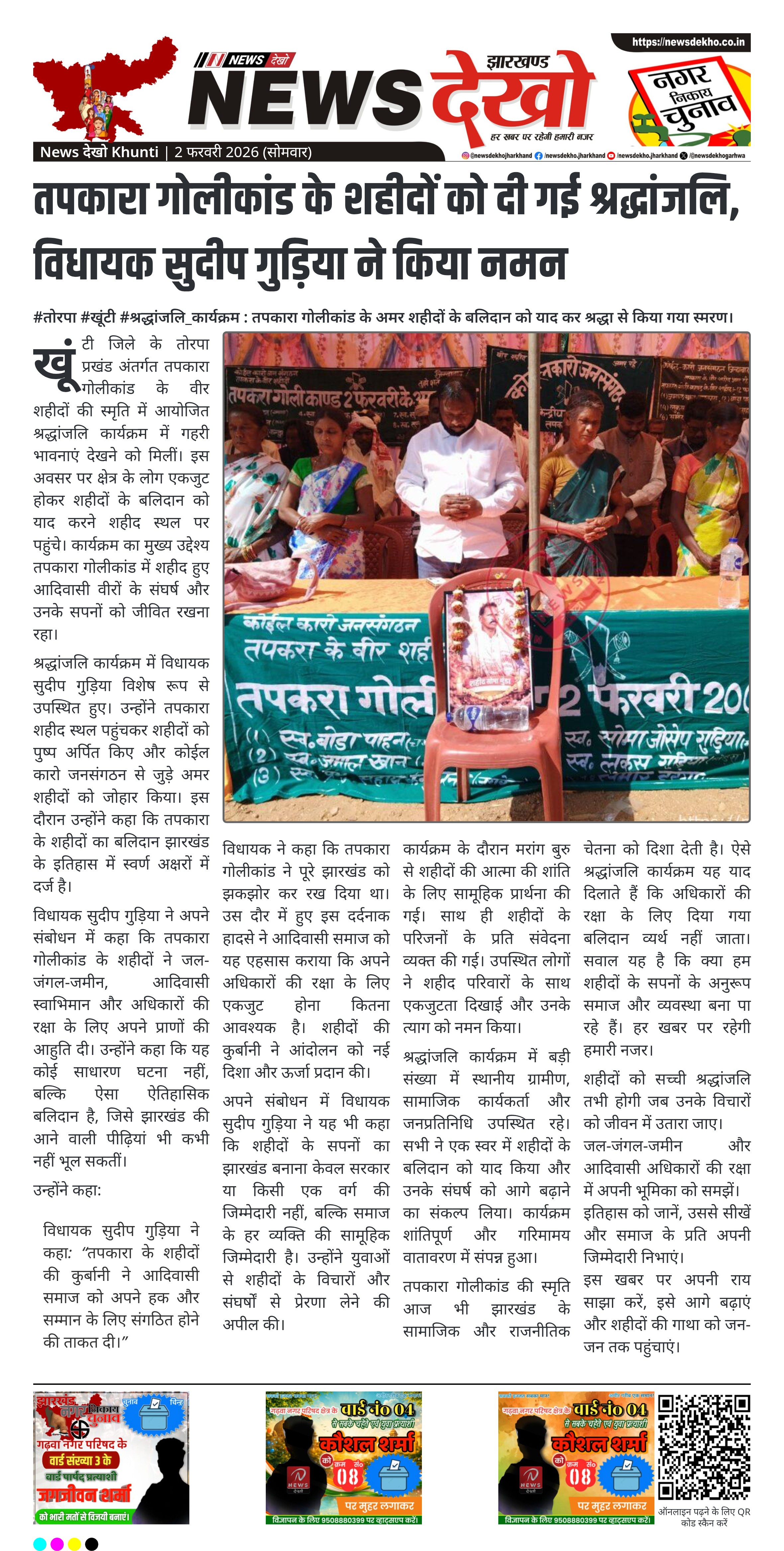 खूंटी जिले के तोरपा प्रखंड स्थित तपकारा गोलीकांड शहीद स्थल पर वीर शहीदों की स्मृति में श्रद्धांजलि कार्यक्रम आयोजित किया गया। कार्यक्रम में विधायक सुदीप गुड़िया ने शहीदों को पुष्प अर्पित कर नमन किया। उन्होंने शहीदों के बलिदान को जल-जंगल-जमीन और आदिवासी अधिकारों की रक्षा का ऐतिहासिक उदाहरण बताया। बड़ी संख्या में ग्रामीणों और सामाजिक कार्यकर्ताओं की उपस्थिति ने आयोजन को भावनात्मक बना दिया।