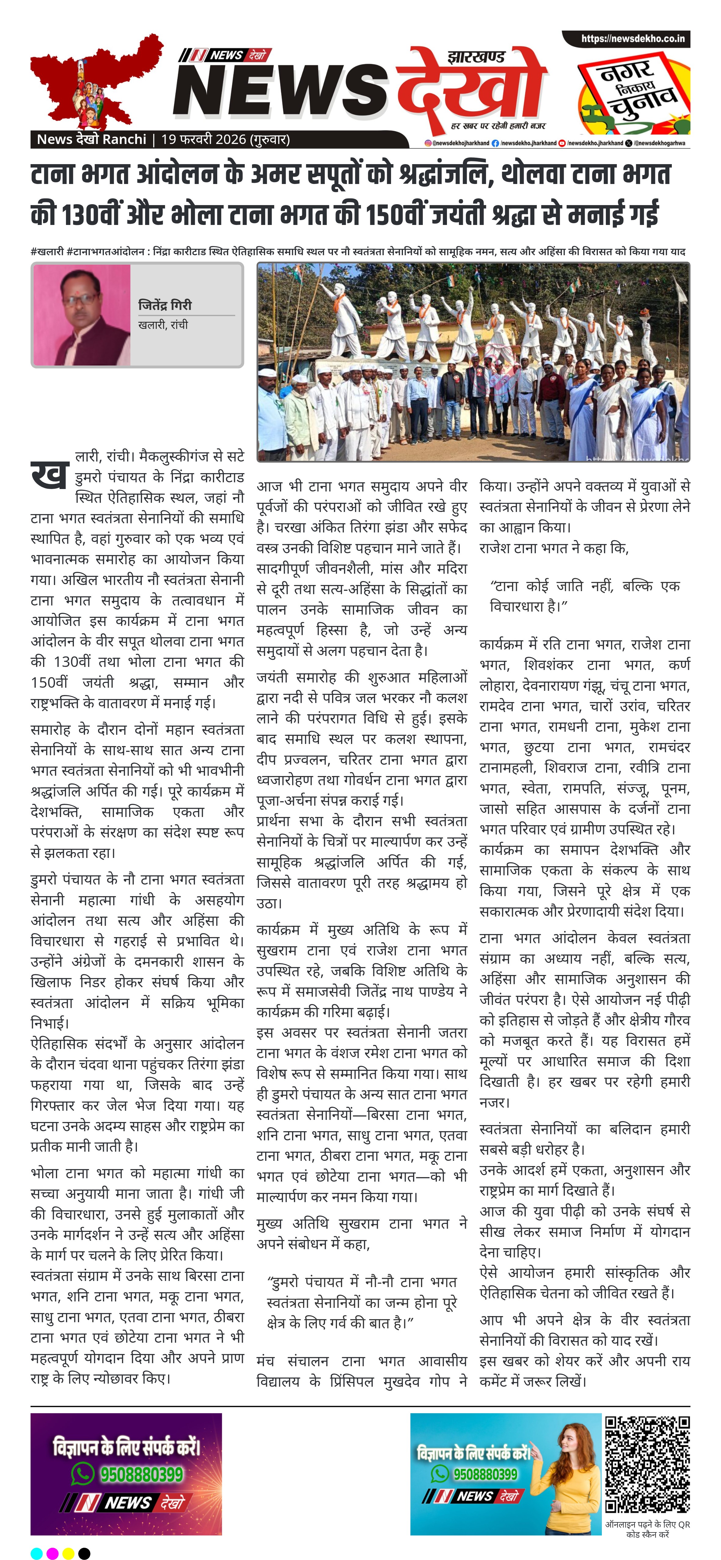 - थोलवा टाना भगत की 130वीं और भोला टाना भगत की 150वीं जयंती श्रद्धापूर्वक मनाई गई।