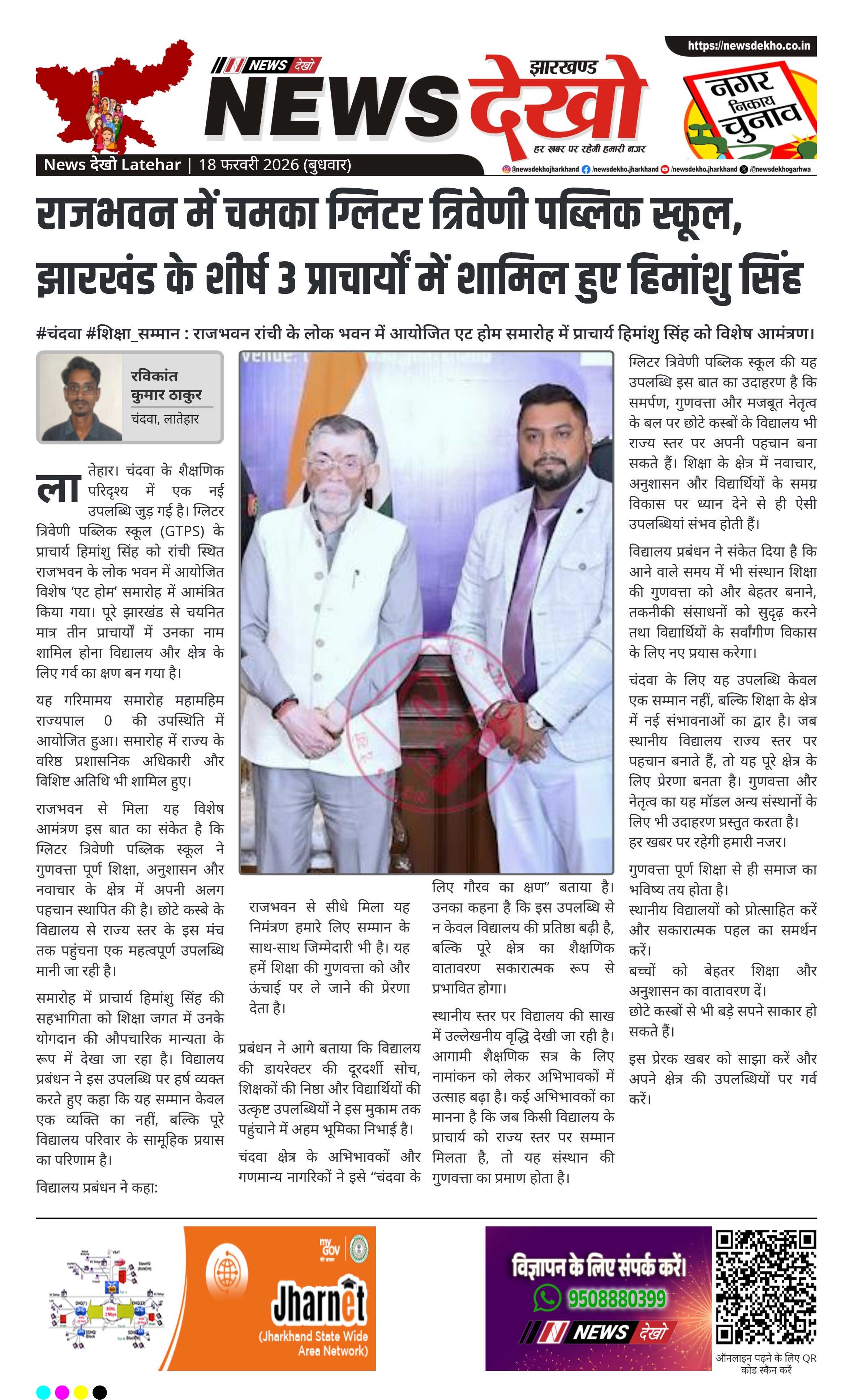 चंदवा के ग्लिटर त्रिवेणी पब्लिक स्कूल के प्राचार्य हिमांशु सिंह को राजभवन रांची में आयोजित एट होम समारोह में विशेष आमंत्रण मिला। पूरे झारखंड से चयनित तीन प्राचार्यों में उनका नाम शामिल होना क्षेत्र के लिए गौरव का विषय है। यह सम्मान विद्यालय की गुणवत्ता पूर्ण शिक्षा और नवाचार की पहचान माना जा रहा है।