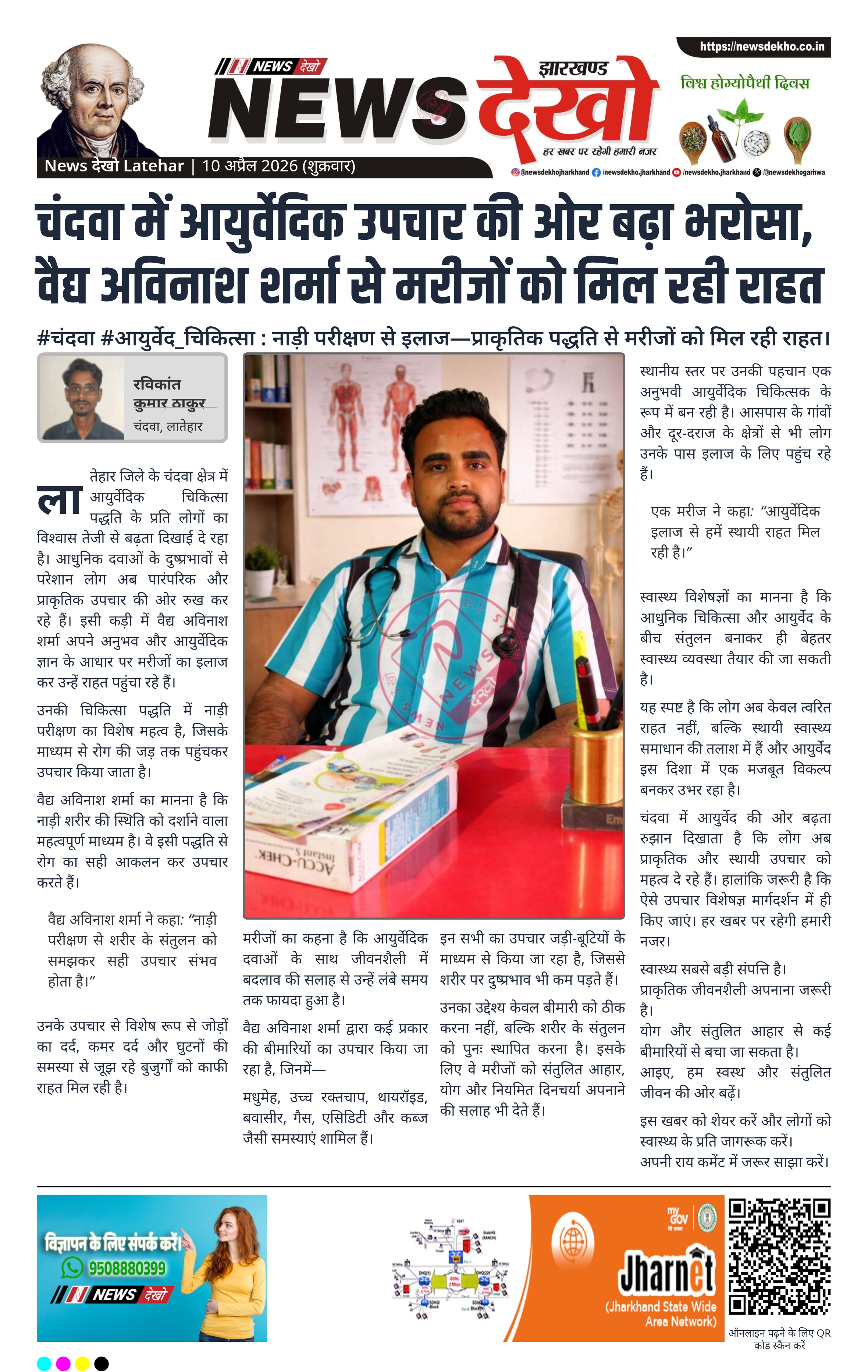 लातेहार जिले के चंदवा क्षेत्र में आयुर्वेदिक चिकित्सा पद्धति के प्रति लोगों का विश्वास तेजी से बढ़ता दिखाई दे रहा है। आधुनिक दवाओं के दुष्प्रभावों से परेशान लोग अब पारंपरिक और प्राकृतिक उपचार की ओर रुख कर रहे हैं। इसी कड़ी में वैद्य अविनाश शर्मा अपने अनुभव और आयुर्वेदिक ज्ञान के आधार पर मरीजों का इलाज कर उन्हें राहत पहुंचा रहे हैं।