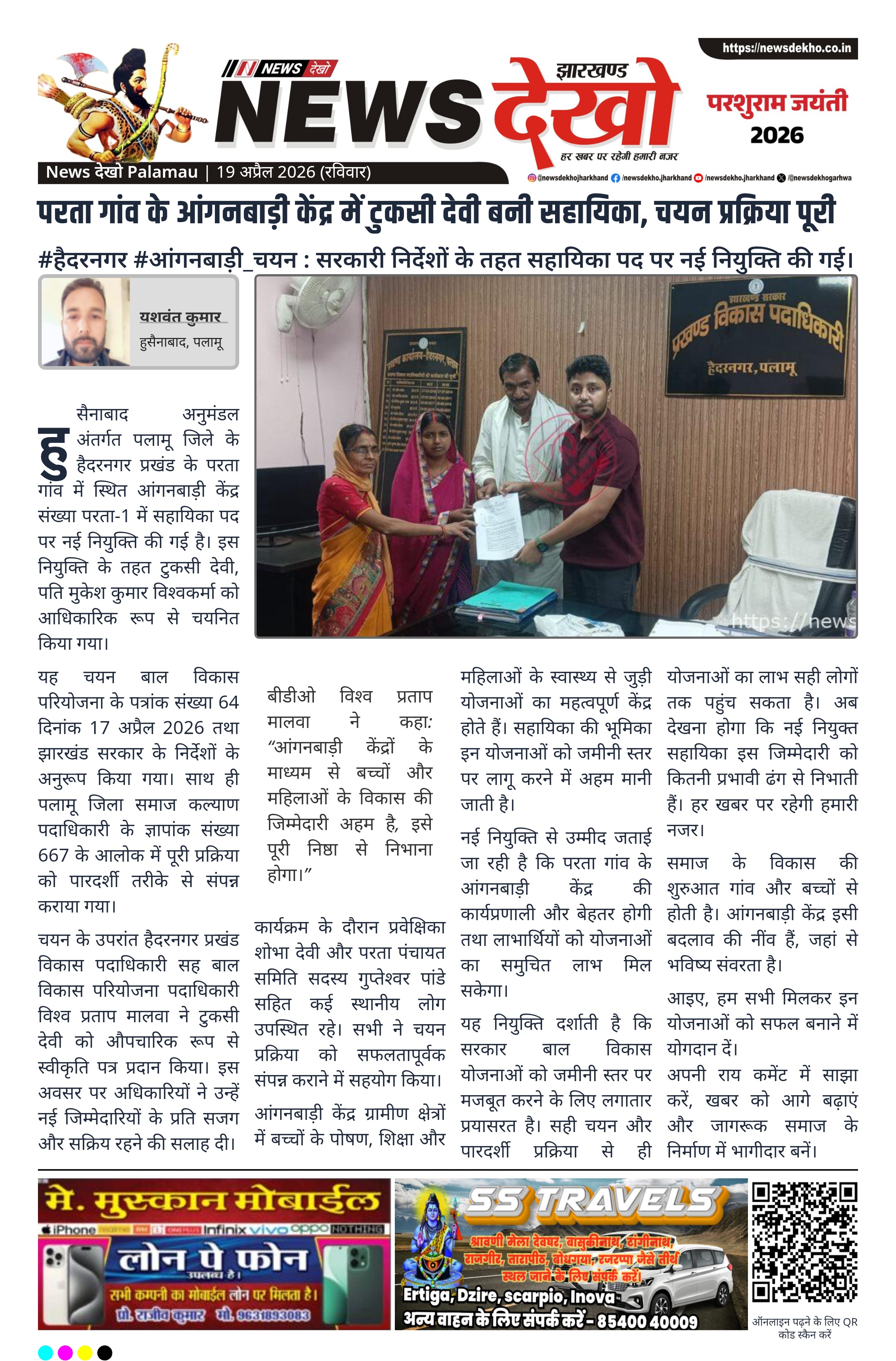 पलामू जिले के हैदरनगर प्रखंड के परता गांव स्थित आंगनबाड़ी केंद्र में सहायिका पद पर टुकसी देवी का चयन किया गया है। यह नियुक्ति बाल विकास परियोजना और झारखंड सरकार के निर्देशों के तहत की गई। चयन प्रक्रिया 10 अप्रैल 2026 को पूरी हुई। अधिकारियों की मौजूदगी में उन्हें स्वीकृति पत्र भी सौंपा गया।
