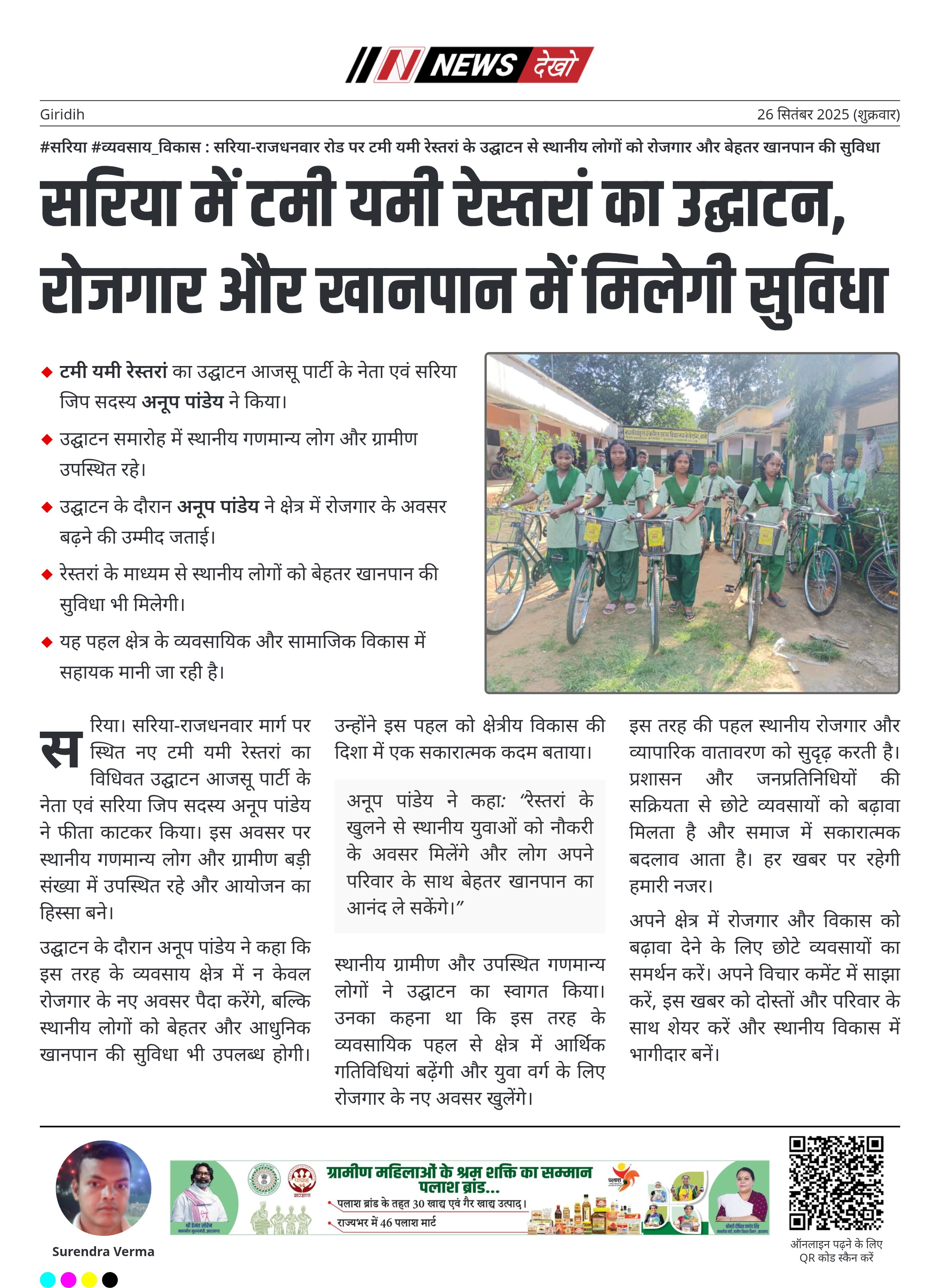#सरिया #व्यवसाय_विकास : सरिया-राजधनवार रोड पर टमी यमी रेस्तरां के उद्घाटन से स्थानीय लोगों को रोजगार और बेहतर खानपान की सुविधा