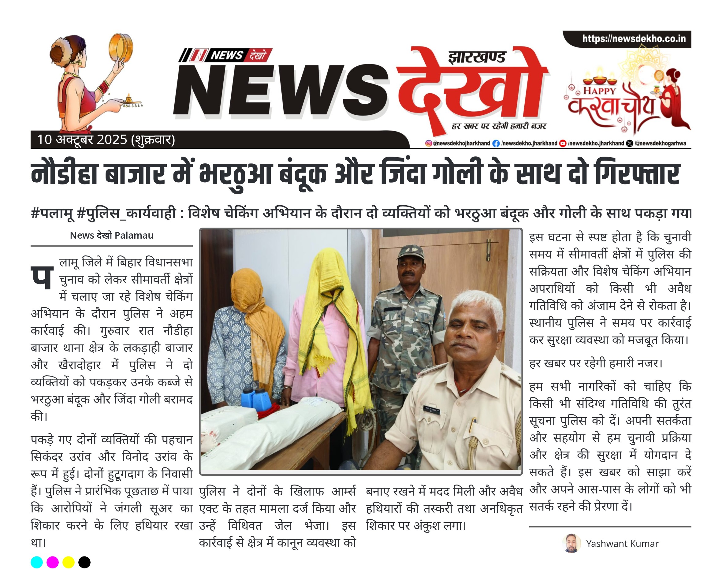 पलामू जिले में बिहार विधानसभा चुनाव को लेकर सीमावर्ती क्षेत्रों में चलाए जा रहे विशेष चेकिंग अभियान के दौरान पुलिस ने अहम कार्रवाई की। गुरुवार रात नौडीहा बाजार थाना क्षेत्र के लकड़ाही बाजार और खैरादोहार में पुलिस ने दो व्यक्तियों को पकड़कर उनके कब्जे से भरठुआ बंदूक और जिंदा गोली बरामद की।