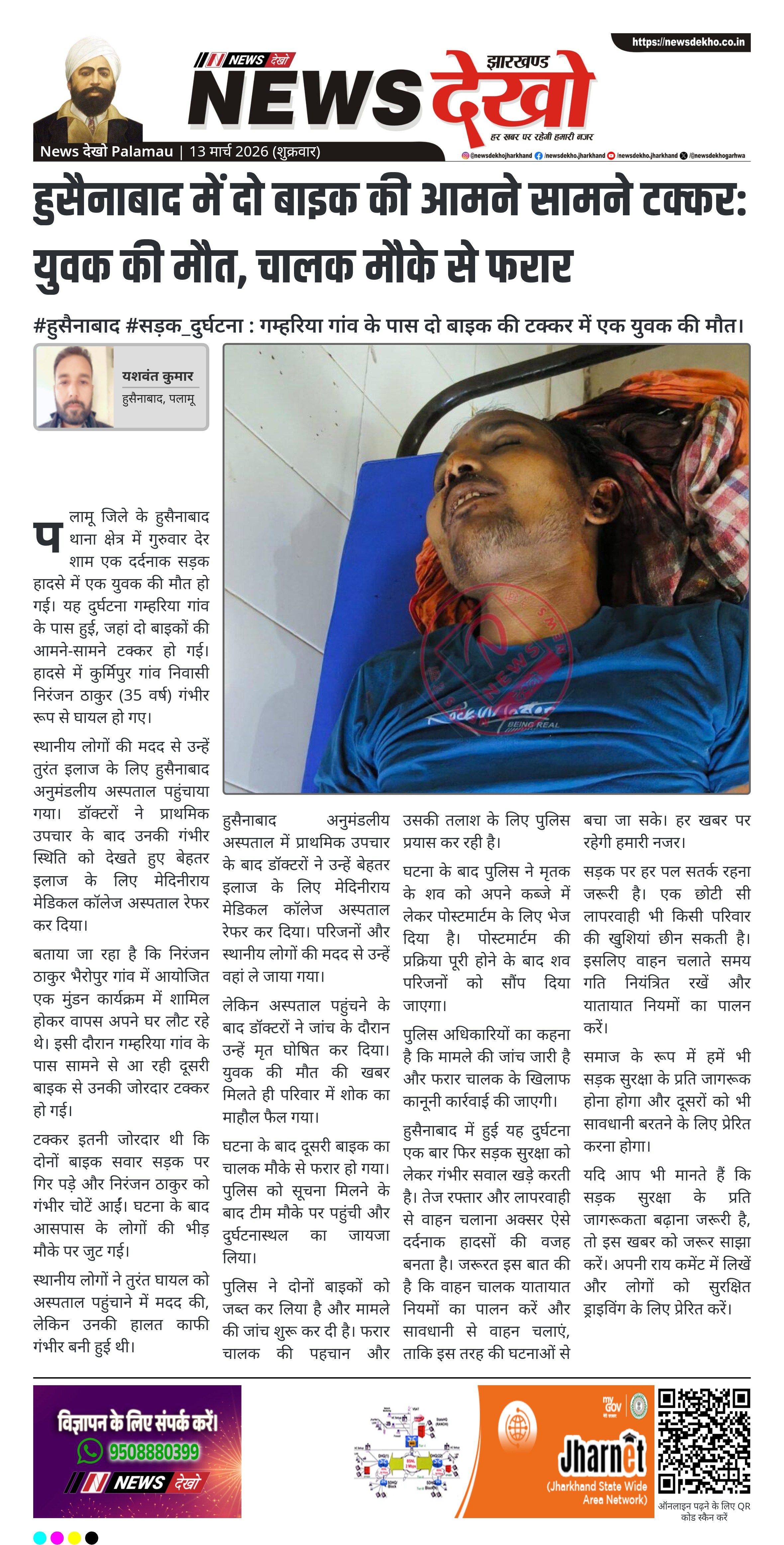 पलामू जिले के हुसैनाबाद थाना क्षेत्र में गुरुवार देर शाम एक दर्दनाक सड़क हादसे में एक युवक की मौत हो गई। यह दुर्घटना गम्हरिया गांव के पास हुई, जहां दो बाइकों की आमने-सामने टक्कर हो गई। हादसे में कुर्मिपुर गांव निवासी निरंजन ठाकुर (35 वर्ष) गंभीर रूप से घायल हो गए।