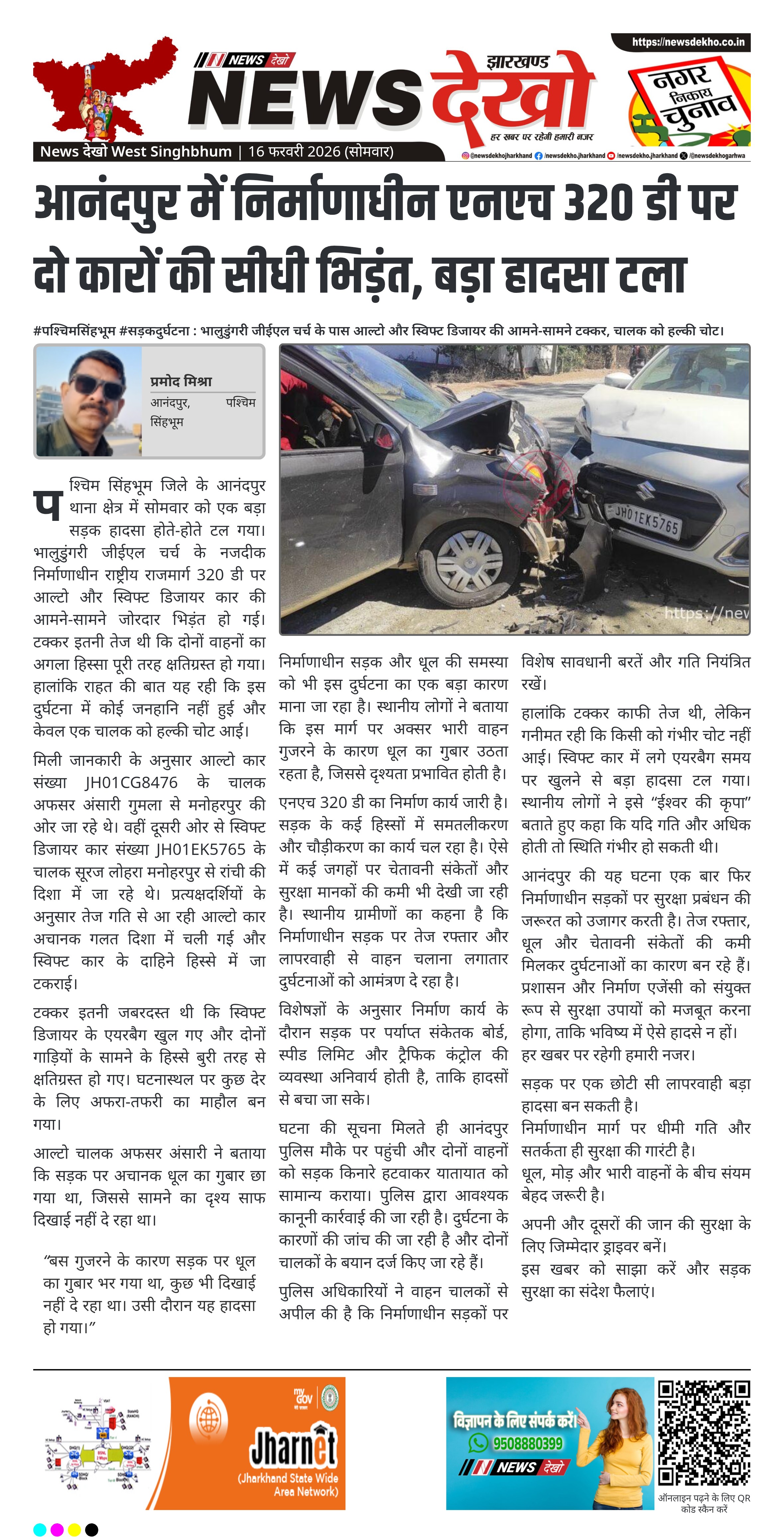पश्चिम सिंहभूम जिले के आनंदपुर थाना क्षेत्र में सोमवार को एक बड़ा सड़क हादसा होते-होते टल गया। भालुडुंगरी जीईएल चर्च के नजदीक निर्माणाधीन राष्ट्रीय राजमार्ग 320 डी पर आल्टो और स्विफ्ट डिजायर कार की आमने-सामने जोरदार भिड़ंत हो गई। टक्कर इतनी तेज थी कि दोनों वाहनों का अगला हिस्सा पूरी तरह क्षतिग्रस्त हो गया। हालांकि राहत की बात यह रही कि इस दुर्घटना में कोई जनहानि नहीं हुई और केवल एक चालक को हल्की चोट आई।