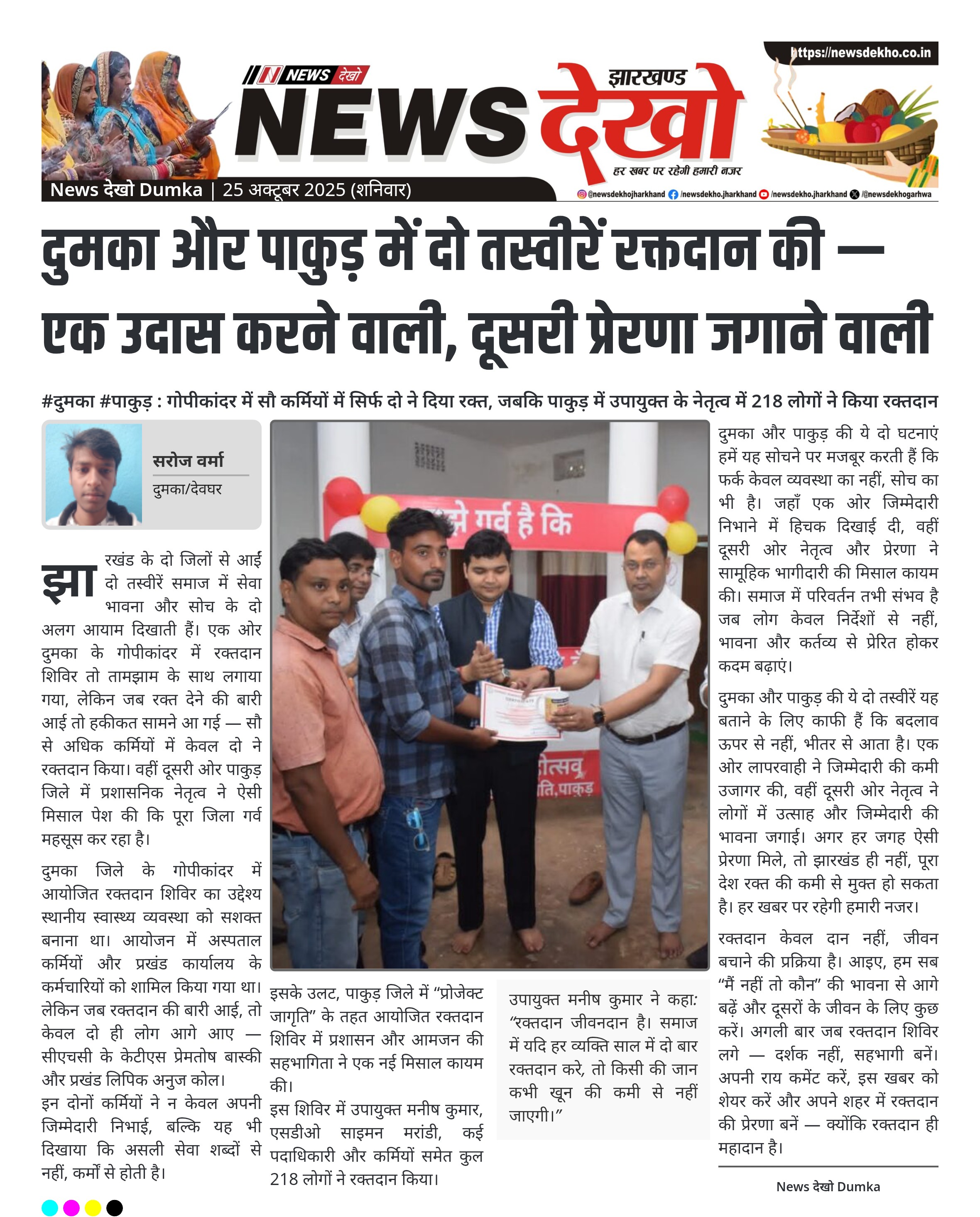 झारखंड के दो जिलों से आईं दो तस्वीरें समाज में सेवा भावना और सोच के दो अलग आयाम दिखाती हैं। एक ओर दुमका के गोपीकांदर में रक्तदान शिविर तो तामझाम के साथ लगाया गया, लेकिन जब रक्त देने की बारी आई तो हकीकत सामने आ गई — सौ से अधिक कर्मियों में केवल दो ने रक्तदान किया। वहीं दूसरी ओर पाकुड़ जिले में प्रशासनिक नेतृत्व ने ऐसी मिसाल पेश की कि पूरा जिला गर्व महसूस कर रहा है।