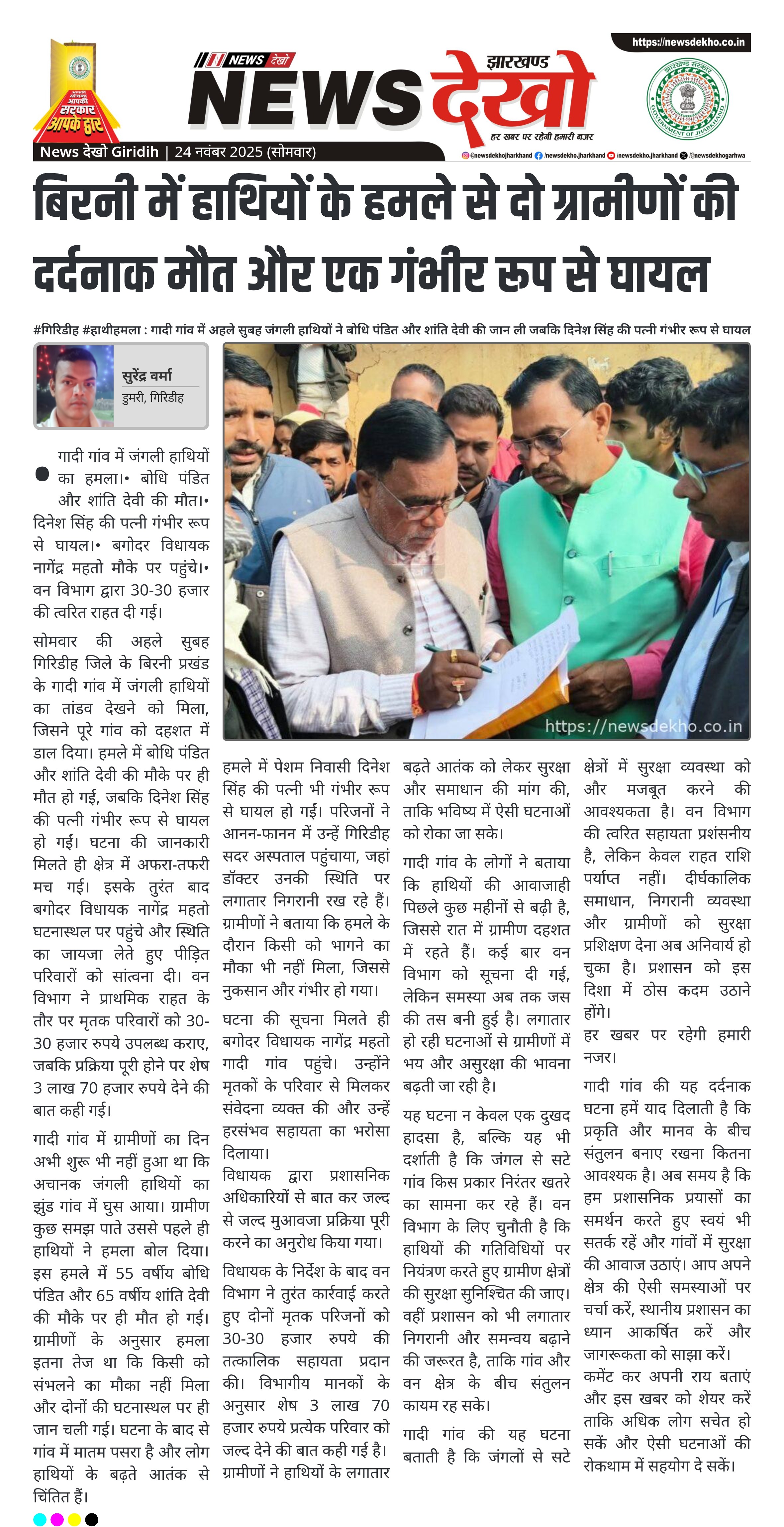 सोमवार की अहले सुबह गिरिडीह जिले के बिरनी प्रखंड के गादी गांव में जंगली हाथियों का तांडव देखने को मिला, जिसने पूरे गांव को दहशत में डाल दिया। हमले में बोधि पंडित और शांति देवी की मौके पर ही मौत हो गई, जबकि दिनेश सिंह की पत्नी गंभीर रूप से घायल हो गईं। घटना की जानकारी मिलते ही क्षेत्र में अफरा-तफरी मच गई। इसके तुरंत बाद बगोदर विधायक नागेंद्र महतो घटनास्थल पर पहुंचे और स्थिति का जायजा लेते हुए पीड़ित परिवारों को सांत्वना दी। वन विभाग ने प्राथमिक राहत के तौर पर मृतक परिवारों को 30-30 हजार रुपये उपलब्ध कराए, जबकि प्रक्रिया पूरी होने पर शेष 3 लाख 70 हजार रुपये देने की बात कही गई।