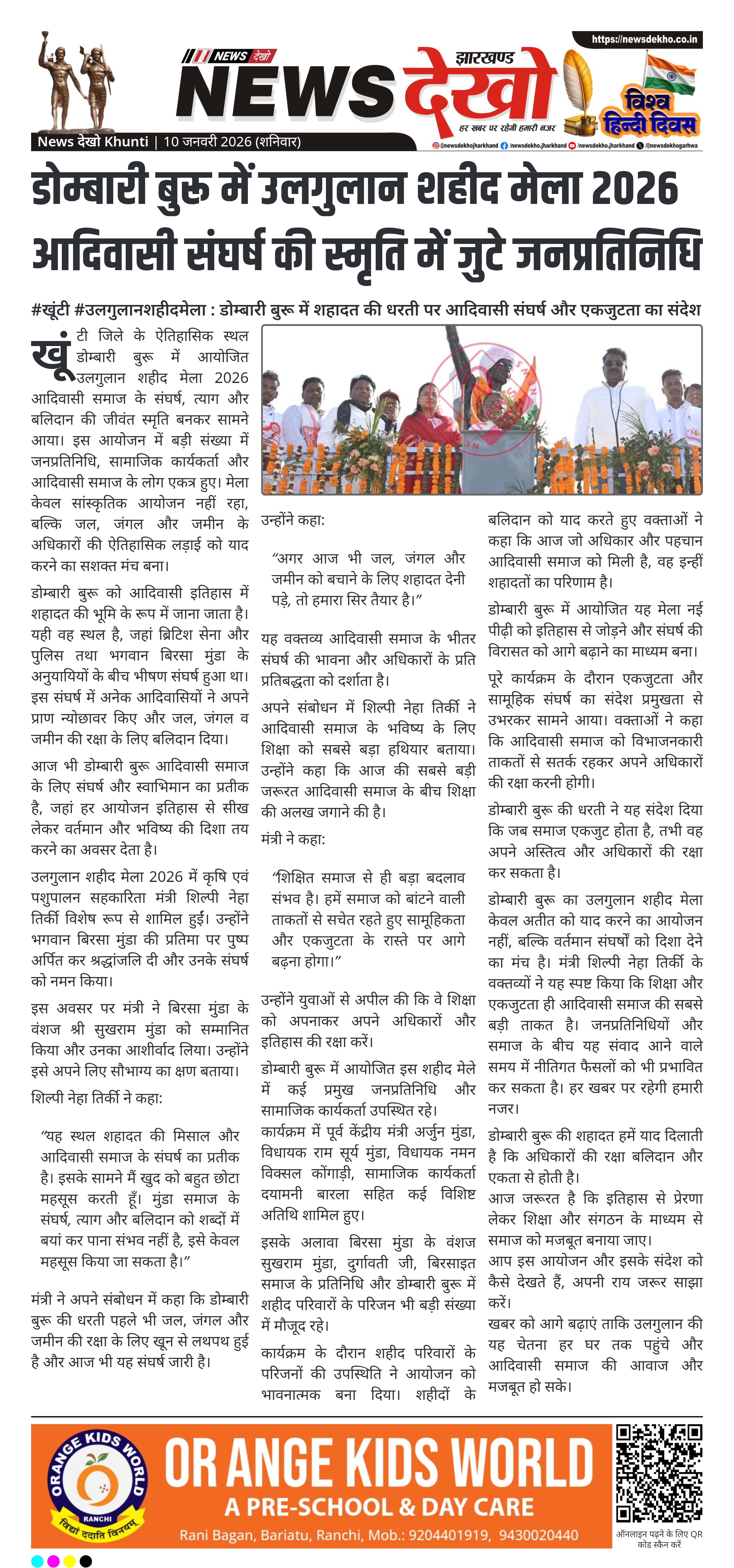 खूंटी जिले के ऐतिहासिक स्थल डोम्बारी बुरू में आयोजित उलगुलान शहीद मेला 2026 आदिवासी समाज के संघर्ष, त्याग और बलिदान की जीवंत स्मृति बनकर सामने आया। इस आयोजन में बड़ी संख्या में जनप्रतिनिधि, सामाजिक कार्यकर्ता और आदिवासी समाज के लोग एकत्र हुए। मेला केवल सांस्कृतिक आयोजन नहीं रहा, बल्कि जल, जंगल और जमीन के अधिकारों की ऐतिहासिक लड़ाई को याद करने का सशक्त मंच बना।