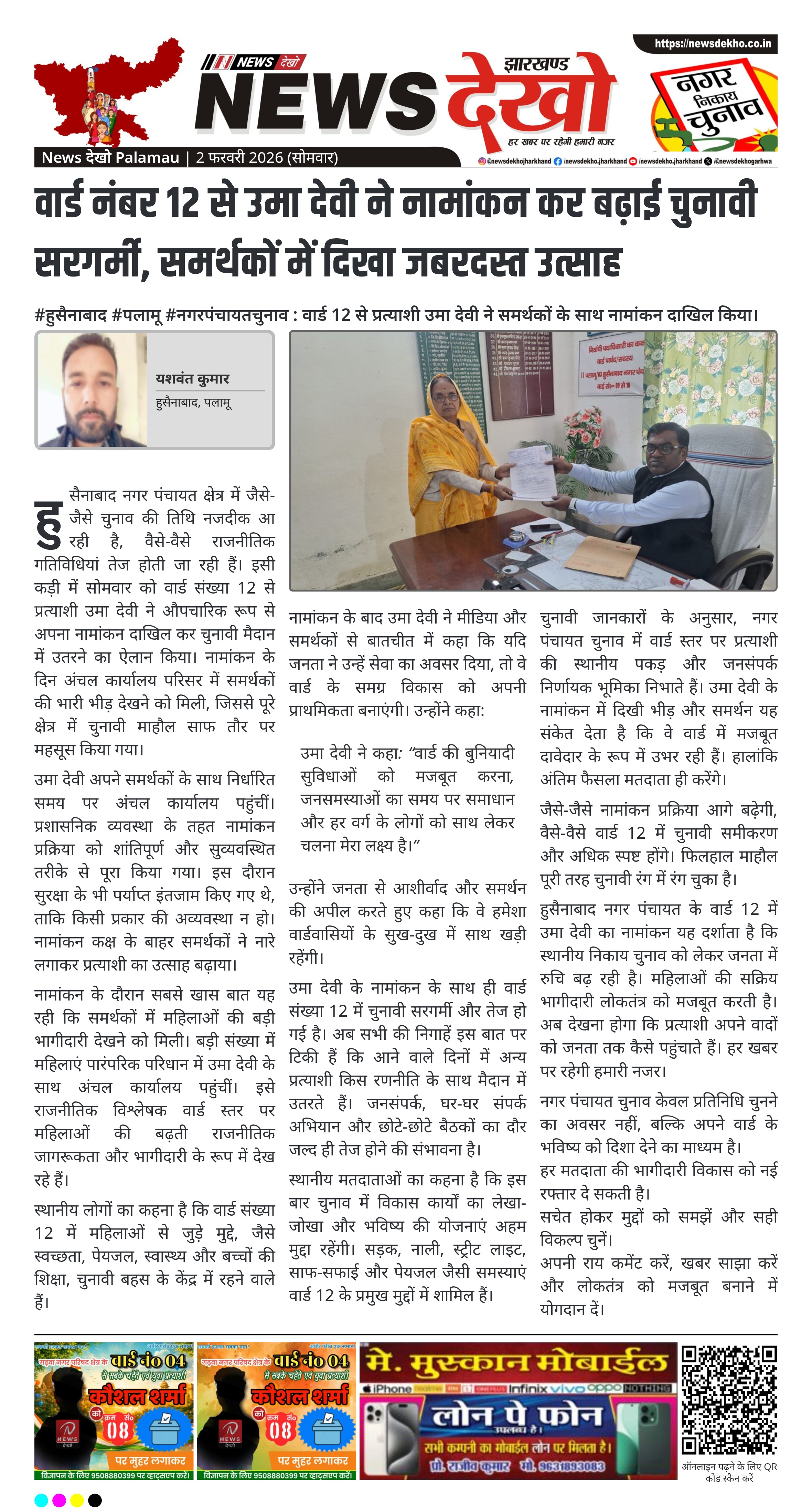 उमा देवी के नामांकन के साथ ही वार्ड संख्या 12 में चुनावी सरगर्मी और तेज हो गई है। अब सभी की निगाहें इस बात पर टिकी हैं कि आने वाले दिनों में अन्य प्रत्याशी किस रणनीति के साथ मैदान में उतरते हैं। जनसंपर्क, घर-घर संपर्क अभियान और छोटे-छोटे बैठकों का दौर जल्द ही तेज होने की संभावना है।