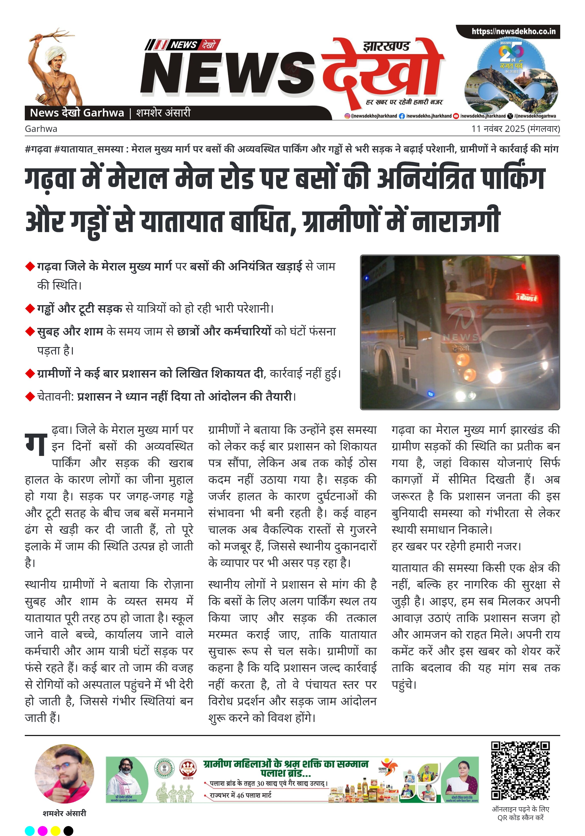 #गढ़वा #यातायात_समस्या : मेराल मुख्य मार्ग पर बसों की अव्यवस्थित पार्किंग और गड्ढों से भरी सड़क ने बढ़ाई परेशानी, ग्रामीणों ने कार्रवाई की मांग की।