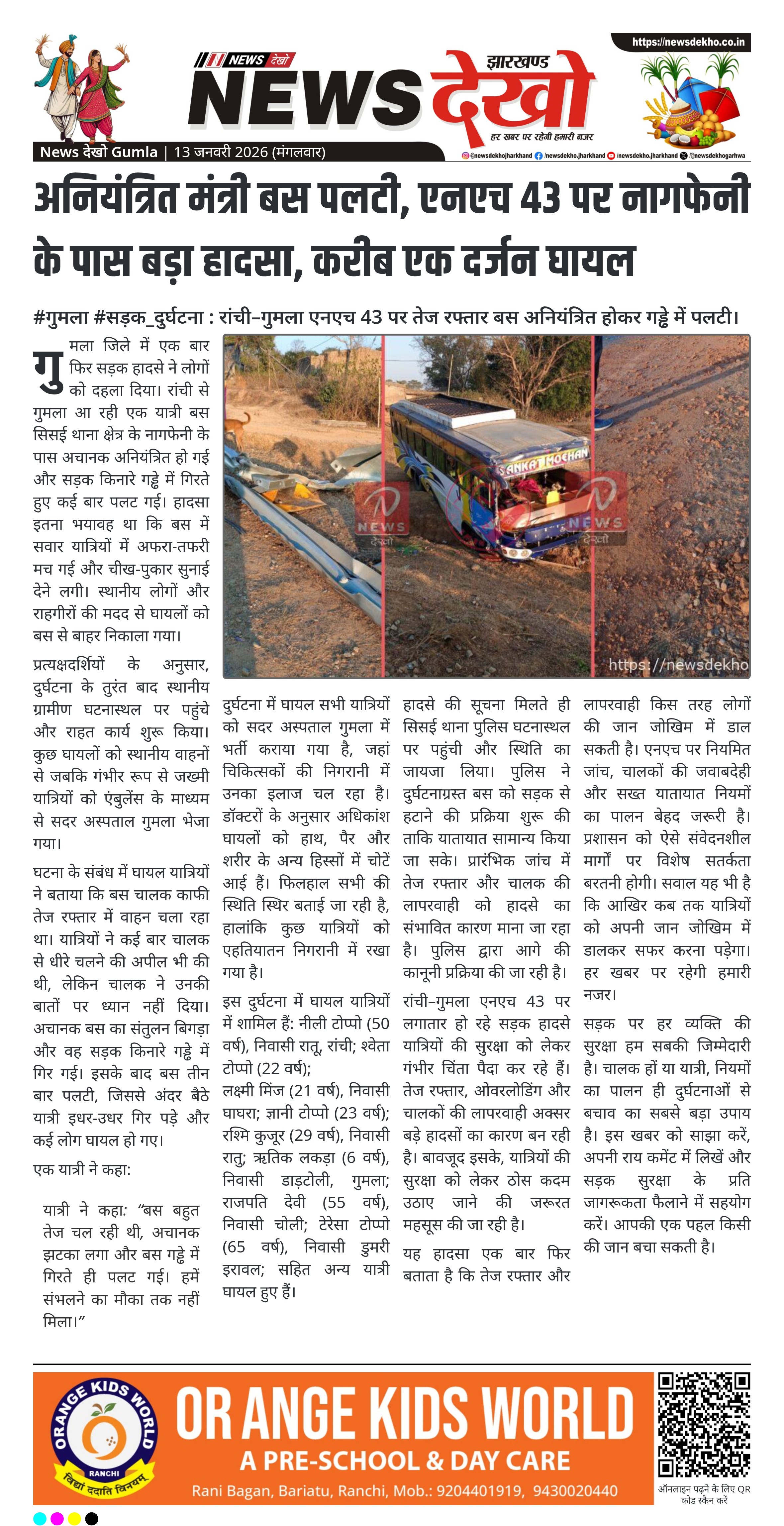 गुमला जिले के सिसई थाना क्षेत्र अंतर्गत नागफेनी के समीप रांची–गुमला राष्ट्रीय राजमार्ग 43 पर एक यात्री बस अनियंत्रित होकर दुर्घटनाग्रस्त हो गई। हादसे में करीब एक दर्जन यात्री घायल हो गए, जिन्हें तत्काल सदर अस्पताल गुमला में भर्ती कराया गया। यात्रियों के अनुसार बस तेज रफ्तार में थी और अचानक नियंत्रण खोकर गड्ढे में गिरते हुए तीन बार पलट गई। घटना ने एक बार फिर एनएच पर यात्री सुरक्षा और तेज रफ्तार पर सवाल खड़े कर दिए हैं।