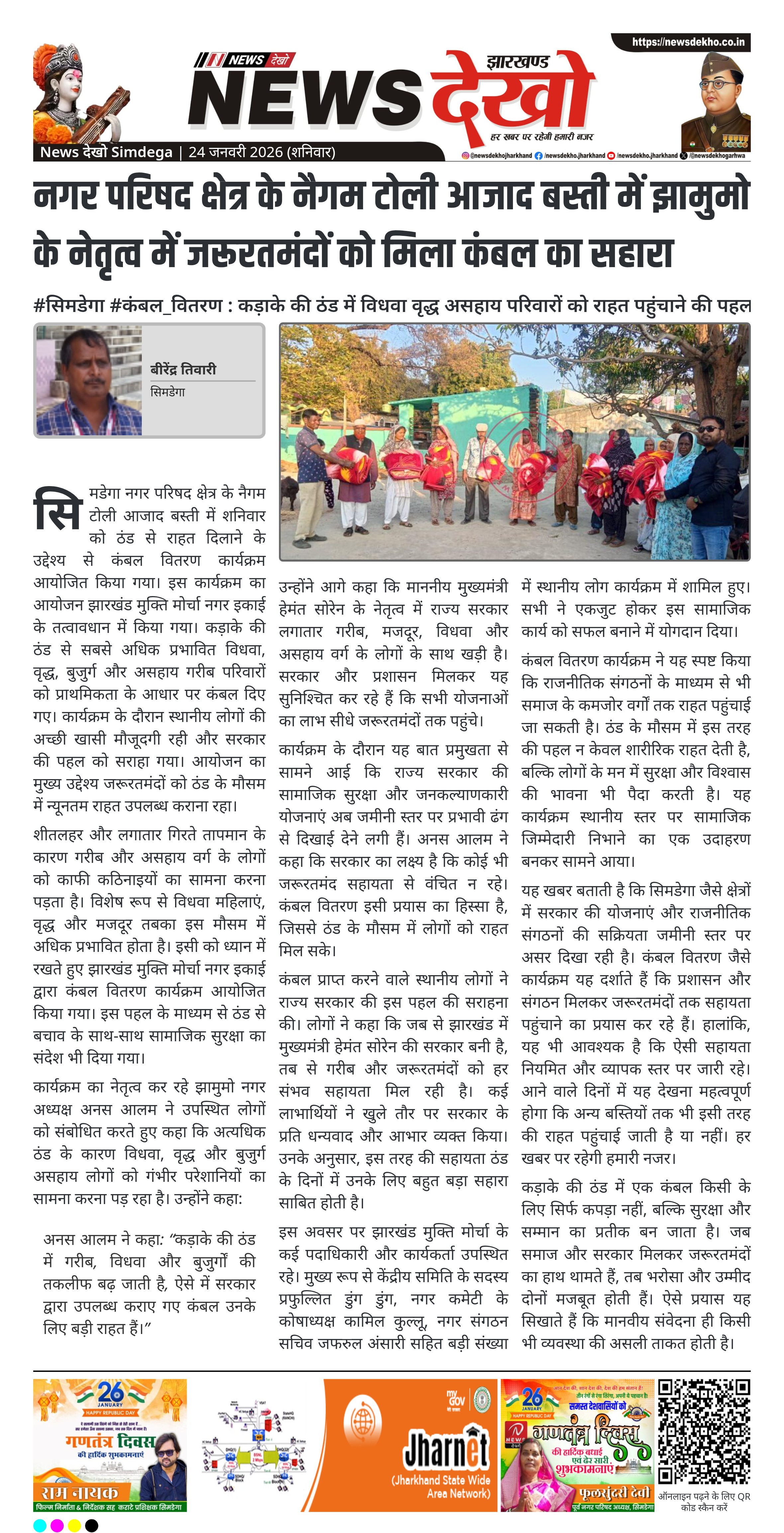 सिमडेगा नगर परिषद क्षेत्र के नैगम टोली आजाद बस्ती में शनिवार को ठंड से राहत दिलाने के उद्देश्य से कंबल वितरण कार्यक्रम आयोजित किया गया। इस कार्यक्रम का आयोजन झारखंड मुक्ति मोर्चा नगर इकाई के तत्वावधान में किया गया। कड़ाके की ठंड से सबसे अधिक प्रभावित विधवा, वृद्ध, बुजुर्ग और असहाय गरीब परिवारों को प्राथमिकता के आधार पर कंबल दिए गए। कार्यक्रम के दौरान स्थानीय लोगों की अच्छी खासी मौजूदगी रही और सरकार की पहल को सराहा गया। आयोजन का मुख्य उद्देश्य जरूरतमंदों को ठंड के मौसम में न्यूनतम राहत उपलब्ध कराना रहा।