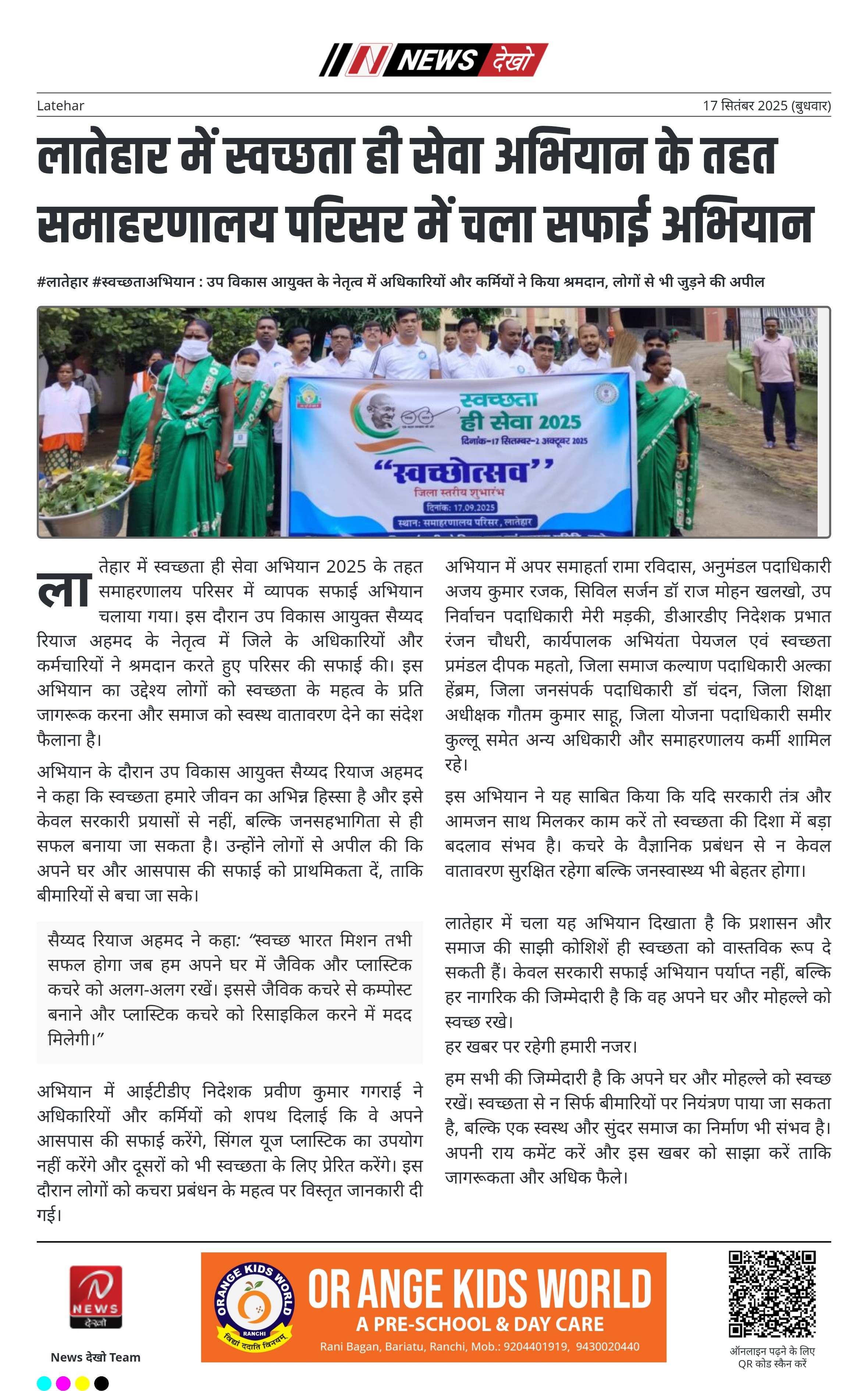 लातेहार में स्वच्छता ही सेवा अभियान 2025 के तहत समाहरणालय परिसर में व्यापक सफाई अभियान चलाया गया। इस दौरान उप विकास आयुक्त सैय्यद रियाज अहमद के नेतृत्व में जिले के अधिकारियों और कर्मचारियों ने श्रमदान करते हुए परिसर की सफाई की। इस अभियान का उद्देश्य लोगों को स्वच्छता के महत्व के प्रति जागरूक करना और समाज को स्वस्थ वातावरण देने का संदेश फैलाना है।
