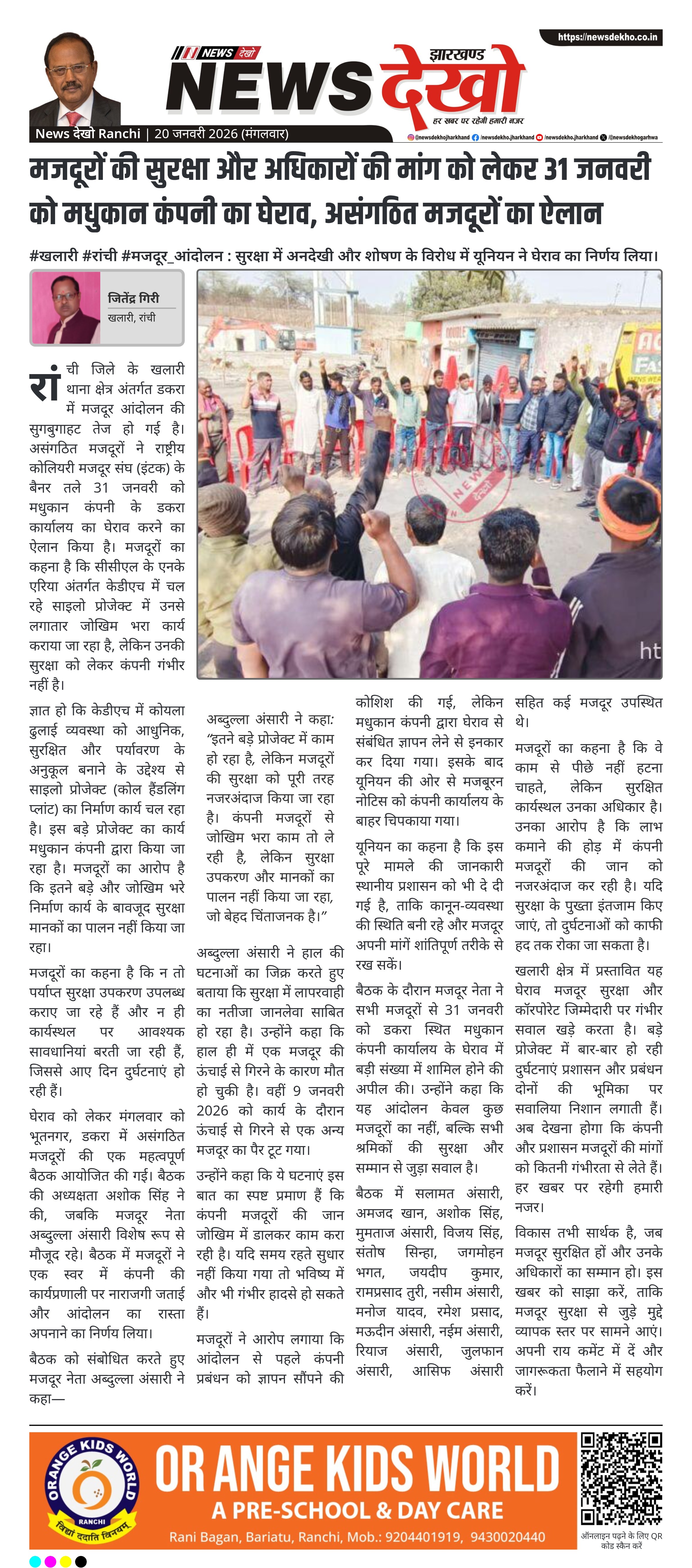 रांची जिले के खलारी थाना क्षेत्र अंतर्गत डकरा में मजदूर आंदोलन की सुगबुगाहट तेज हो गई है। असंगठित मजदूरों ने राष्ट्रीय कोलियरी मजदूर संघ (इंटक) के बैनर तले 31 जनवरी को मधुकान कंपनी के डकरा कार्यालय का घेराव करने का ऐलान किया है। मजदूरों का कहना है कि सीसीएल के एनके एरिया अंतर्गत केडीएच में चल रहे साइलो प्रोजेक्ट में उनसे लगातार जोखिम भरा कार्य कराया जा रहा है, लेकिन उनकी सुरक्षा को लेकर कंपनी गंभीर नहीं है।