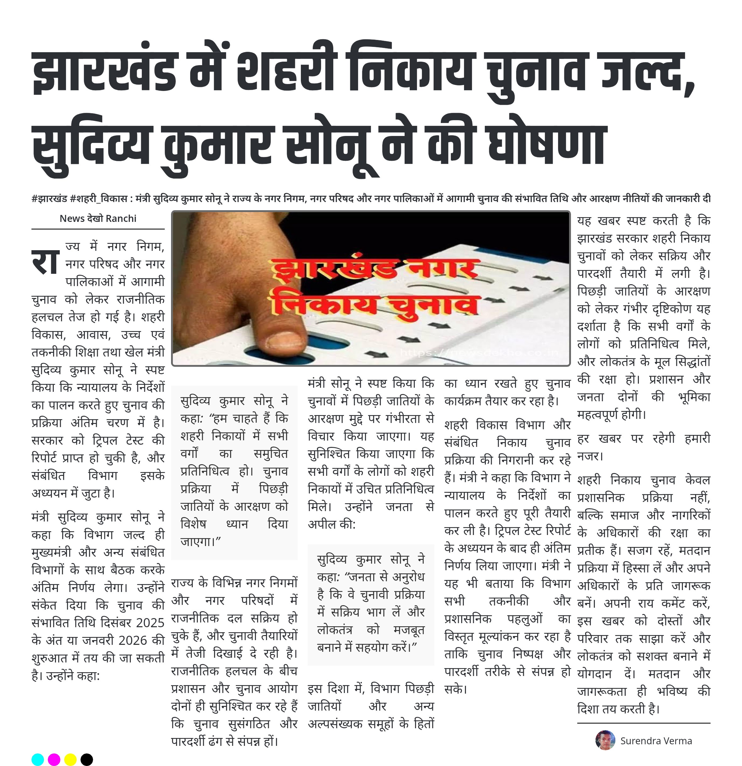 • शहरी विकास मंत्री सुदिव्य कुमार सोनू ने बताया कि सभी शहरी निकायों के चुनाव जल्द कराए जाएंगे