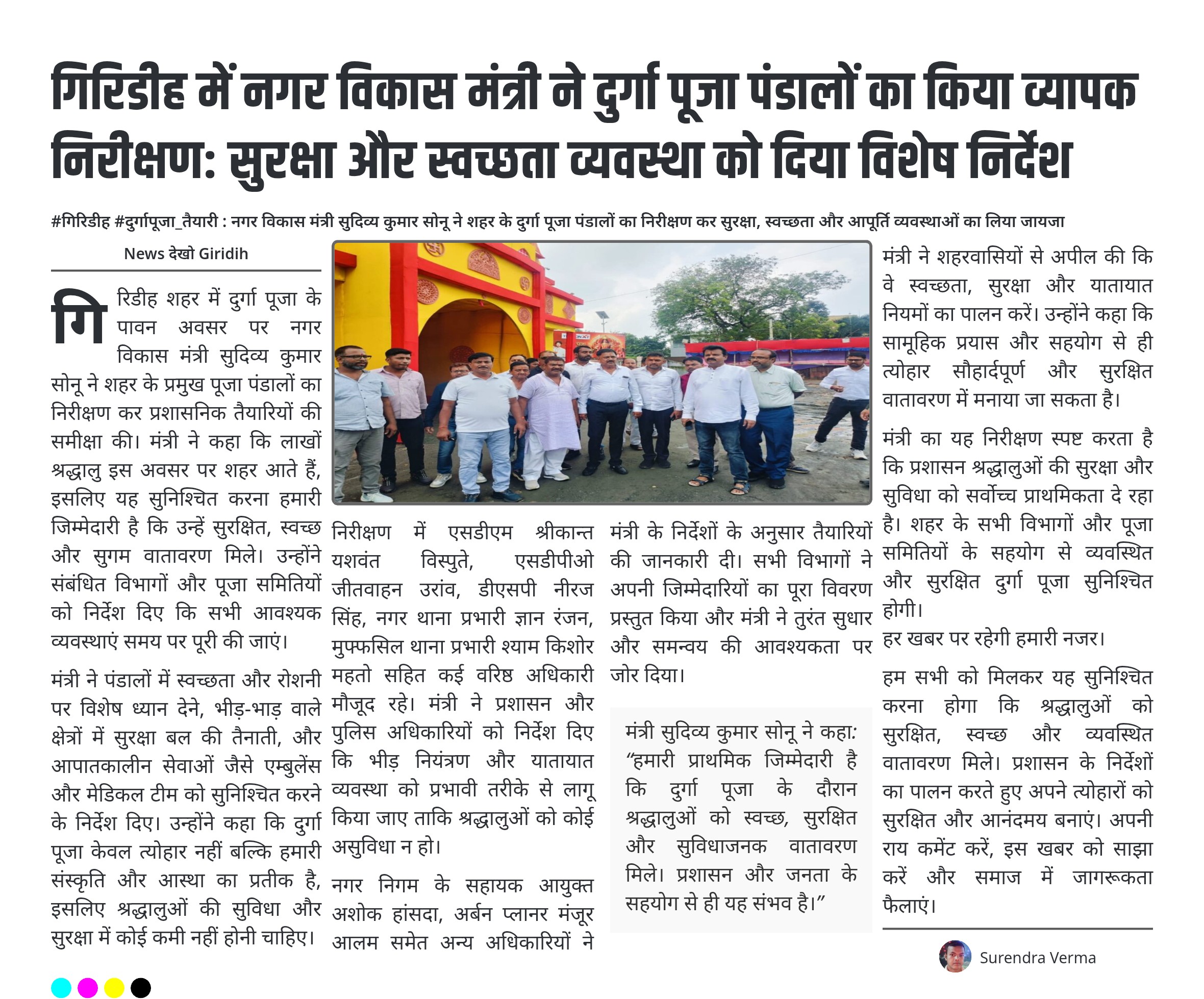 गिरिडीह में नगर विकास मंत्री ने दुर्गा पूजा पंडालों का किया व्यापक निरीक्षण: सुरक्षा और स्वच्छता व्यवस्था को दिया विशेष निर्देश