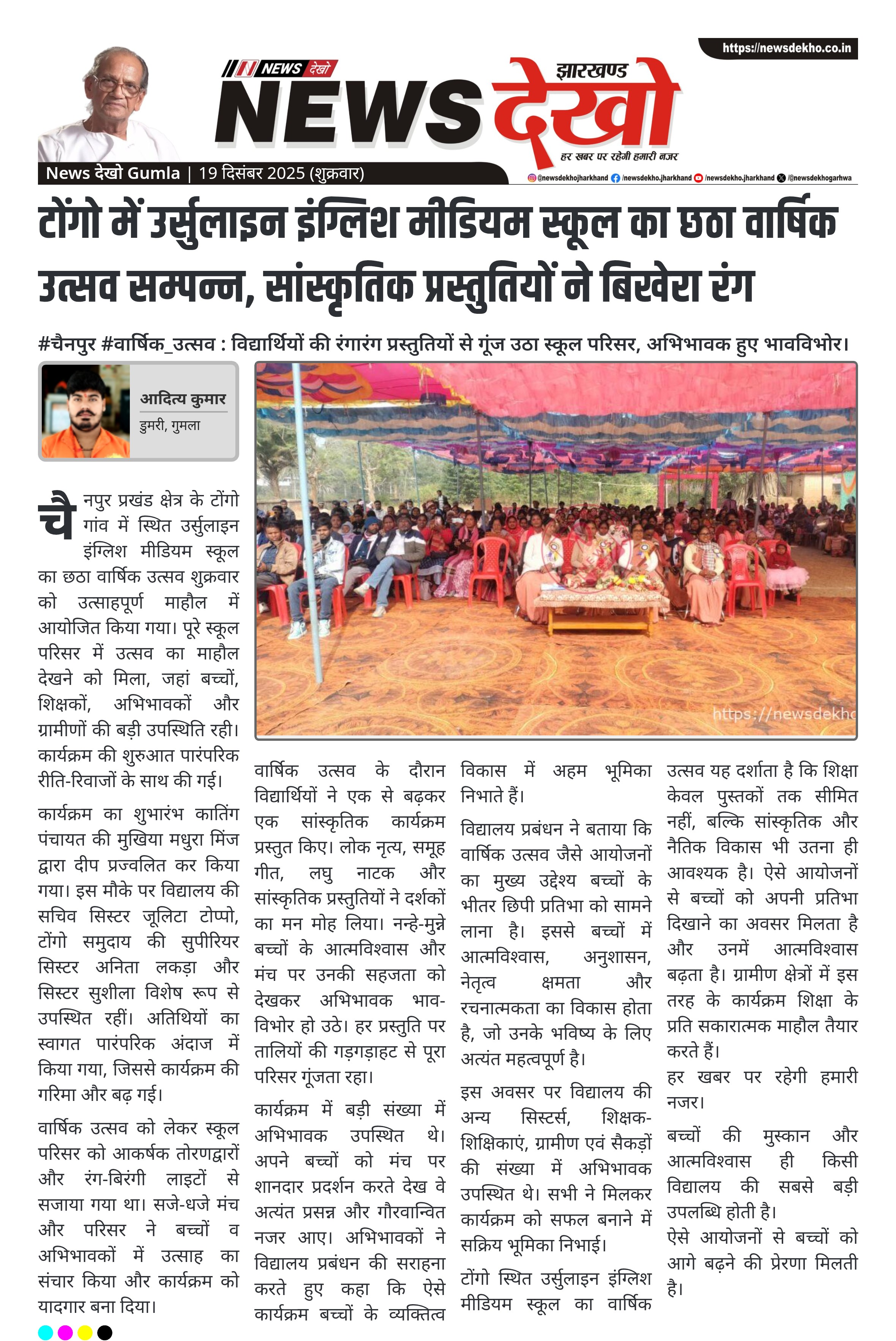 टोंगो स्थित उर्सुलाइन इंग्लिश मीडियम स्कूल का वार्षिक उत्सव यह दर्शाता है कि शिक्षा केवल पुस्तकों तक सीमित नहीं, बल्कि सांस्कृतिक और नैतिक विकास भी उतना ही आवश्यक है। ऐसे आयोजनों से बच्चों को अपनी प्रतिभा दिखाने का अवसर मिलता है और उनमें आत्मविश्वास बढ़ता है। ग्रामीण क्षेत्रों में इस तरह के कार्यक्रम शिक्षा के प्रति सकारात्मक माहौल तैयार करते हैं।