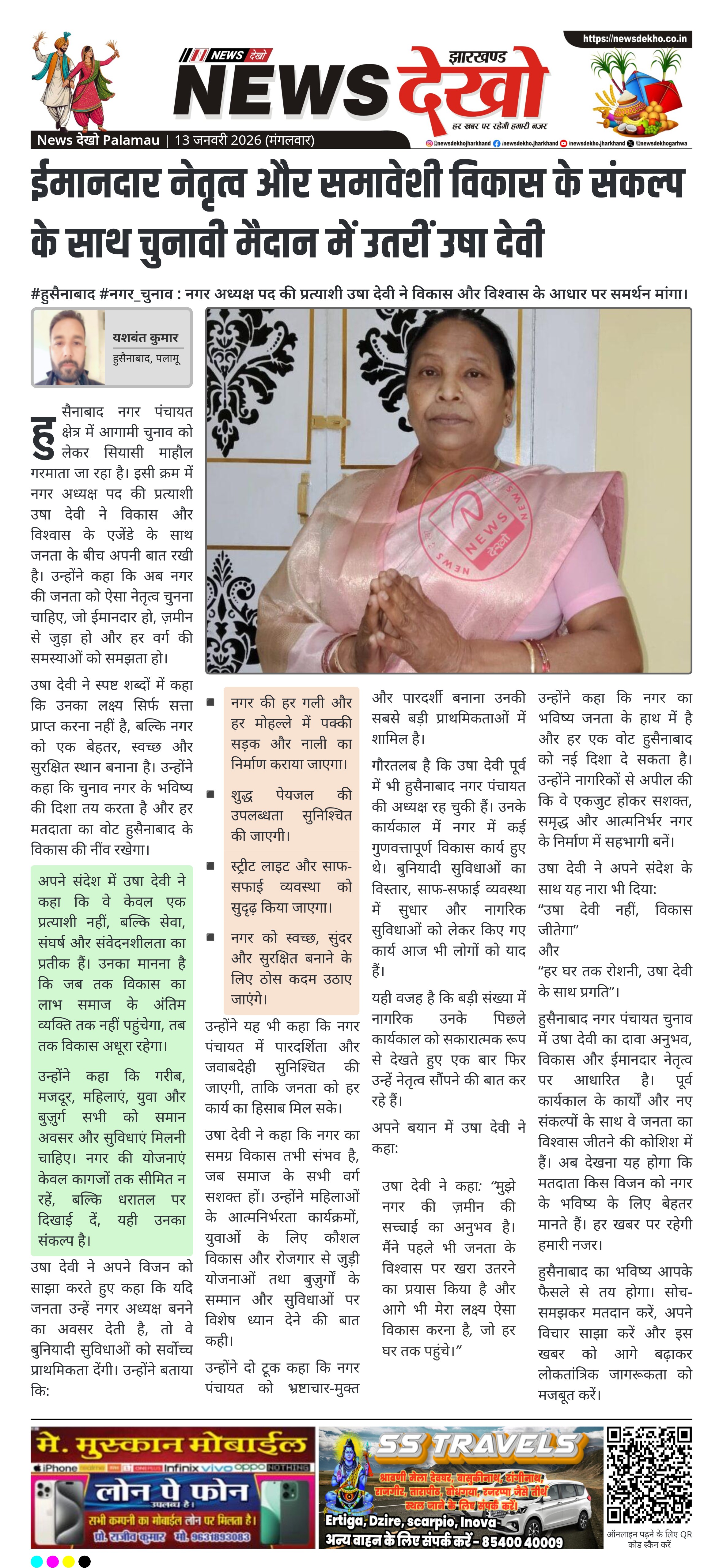 हुसैनाबाद नगर पंचायत चुनाव को लेकर राजनीतिक गतिविधियां तेज हो गई हैं और नगर अध्यक्ष पद की प्रत्याशी उषा देवी ने अपने संकल्पों के साथ जनसंपर्क अभियान को धार दी है। उन्होंने ईमानदार नेतृत्व, स्वच्छ प्रशासन और समावेशी विकास को अपनी प्राथमिकता बताते हुए जनता से समर्थन की अपील की। उषा देवी ने कहा कि उनका उद्देश्य केवल चुनाव जीतना नहीं, बल्कि नगर के हर नागरिक के जीवन में सकारात्मक बदलाव लाना है। यह चुनाव हुसैनाबाद के भविष्य की दिशा तय करने वाला साबित हो सकता है।