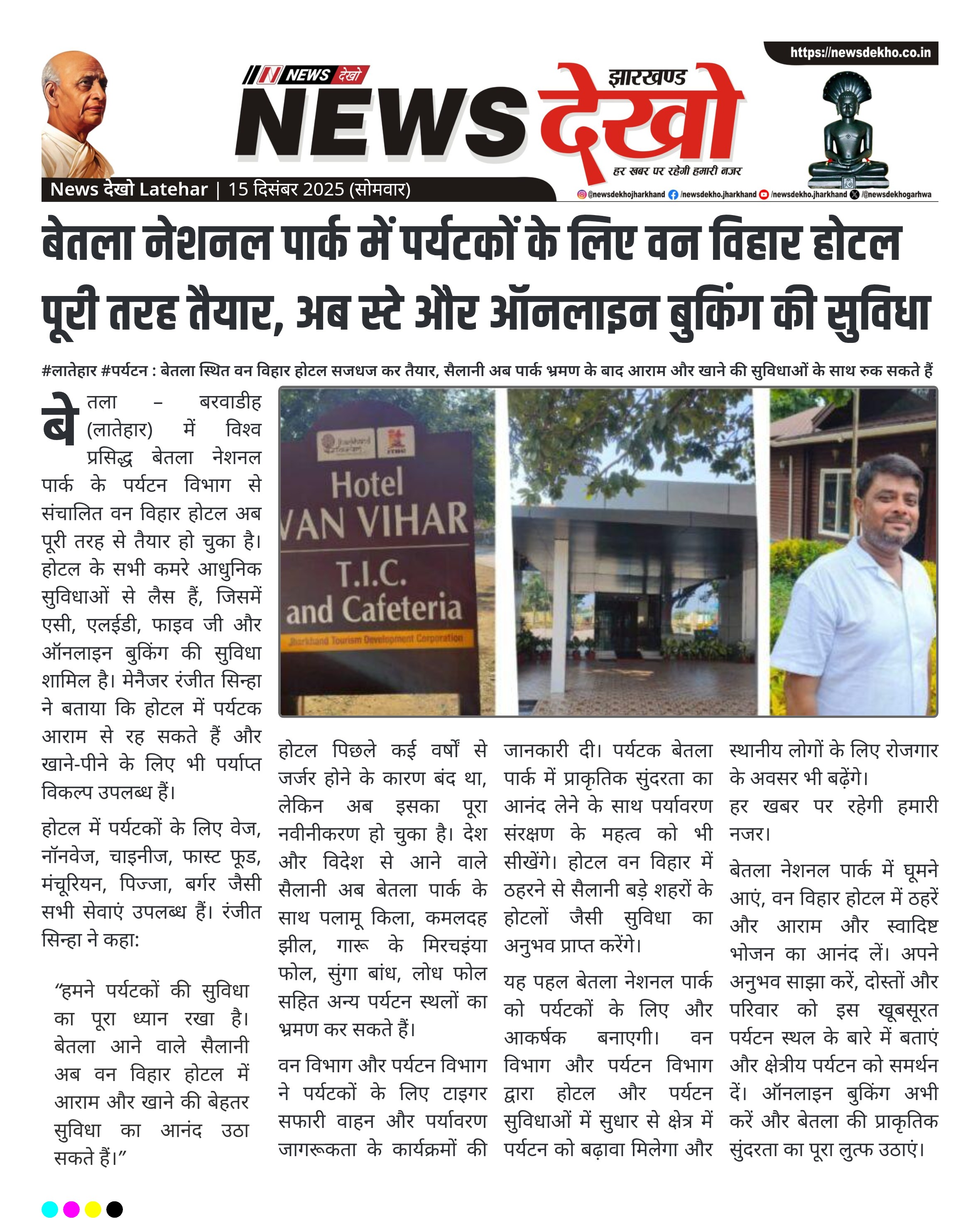 “हमने पर्यटकों की सुविधा का पूरा ध्यान रखा है। बेतला आने वाले सैलानी अब वन विहार होटल में आराम और खाने की बेहतर सुविधा का आनंद उठा सकते हैं।”
