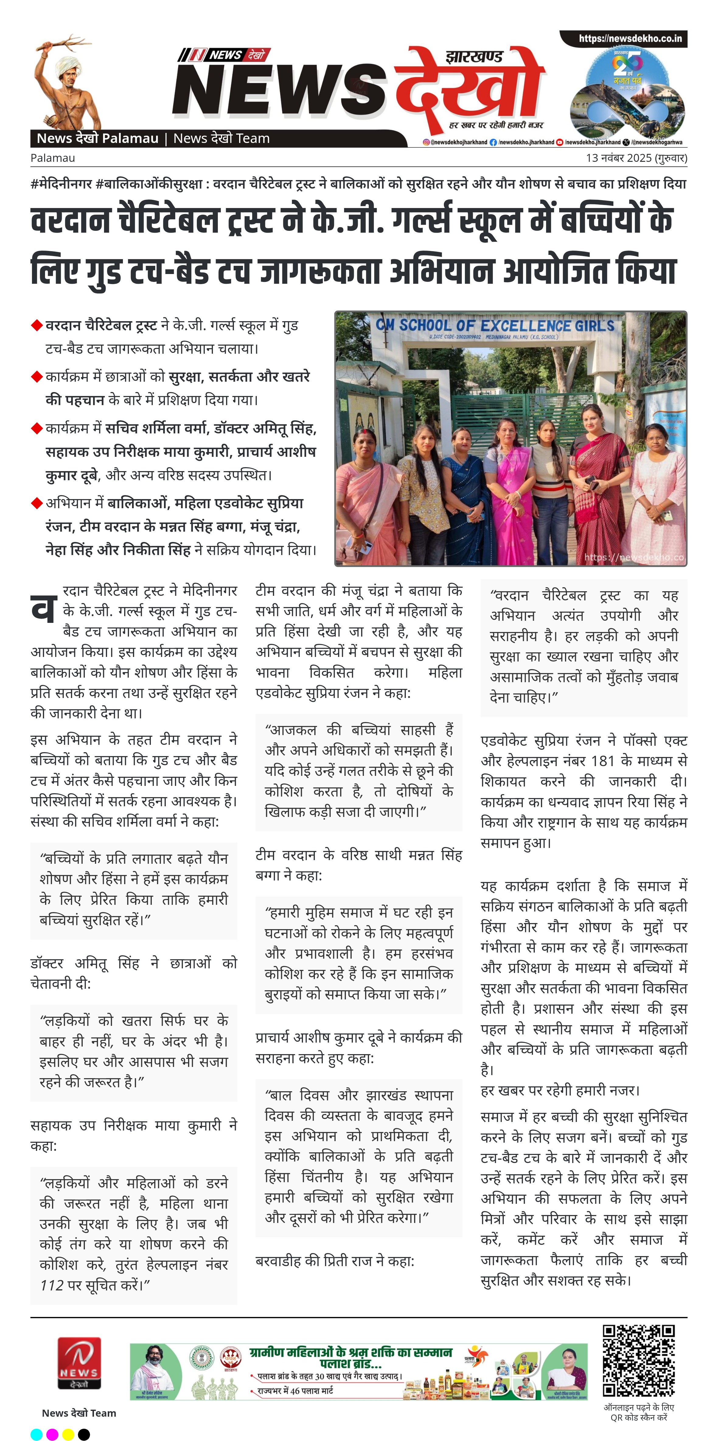 न्यूज़ देखो: वरदान चैरिटेबल ट्रस्ट का गुड टच-बैड टच अभियान बालिकाओं को सजग और सुरक्षित बनाता है