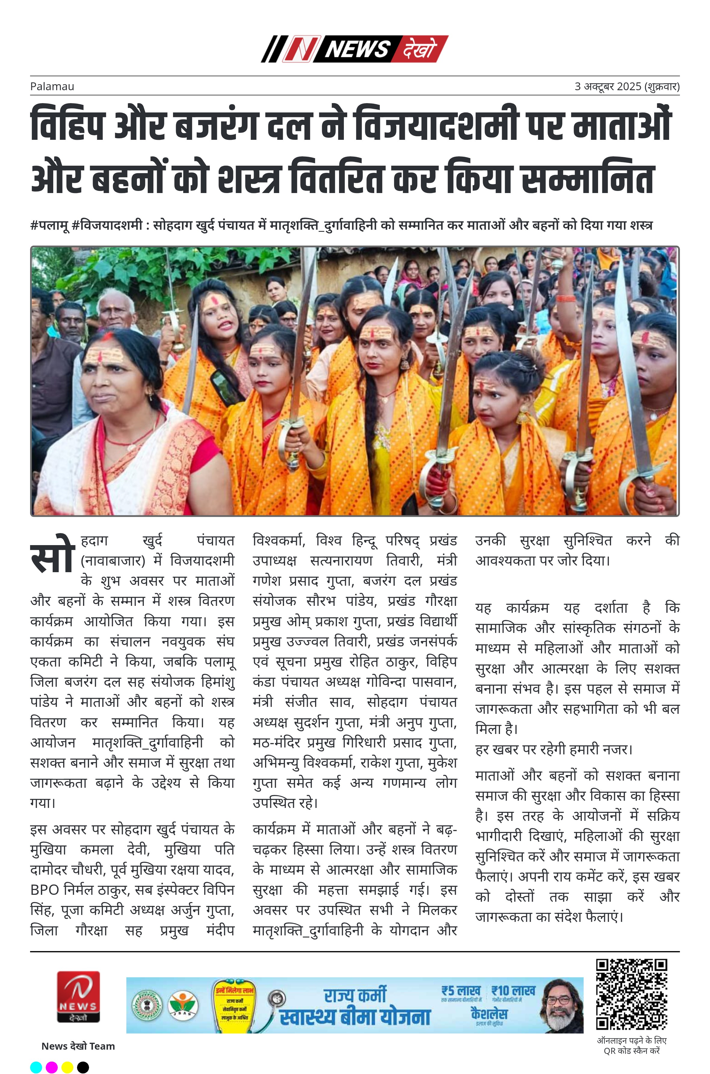सोहदाग खुर्द पंचायत (नावाबाजार) में विजयादशमी के शुभ अवसर पर माताओं और बहनों के सम्मान में शस्त्र वितरण कार्यक्रम आयोजित किया गया। इस कार्यक्रम का संचालन नवयुवक संघ एकता कमिटी ने किया, जबकि पलामू जिला बजरंग दल सह संयोजक हिमांशु पांडेय ने माताओं और बहनों को शस्त्र वितरण कर सम्मानित किया। यह आयोजन मातृशक्ति_दुर्गावाहिनी को सशक्त बनाने और समाज में सुरक्षा तथा जागरूकता बढ़ाने के उद्देश्य से किया गया।