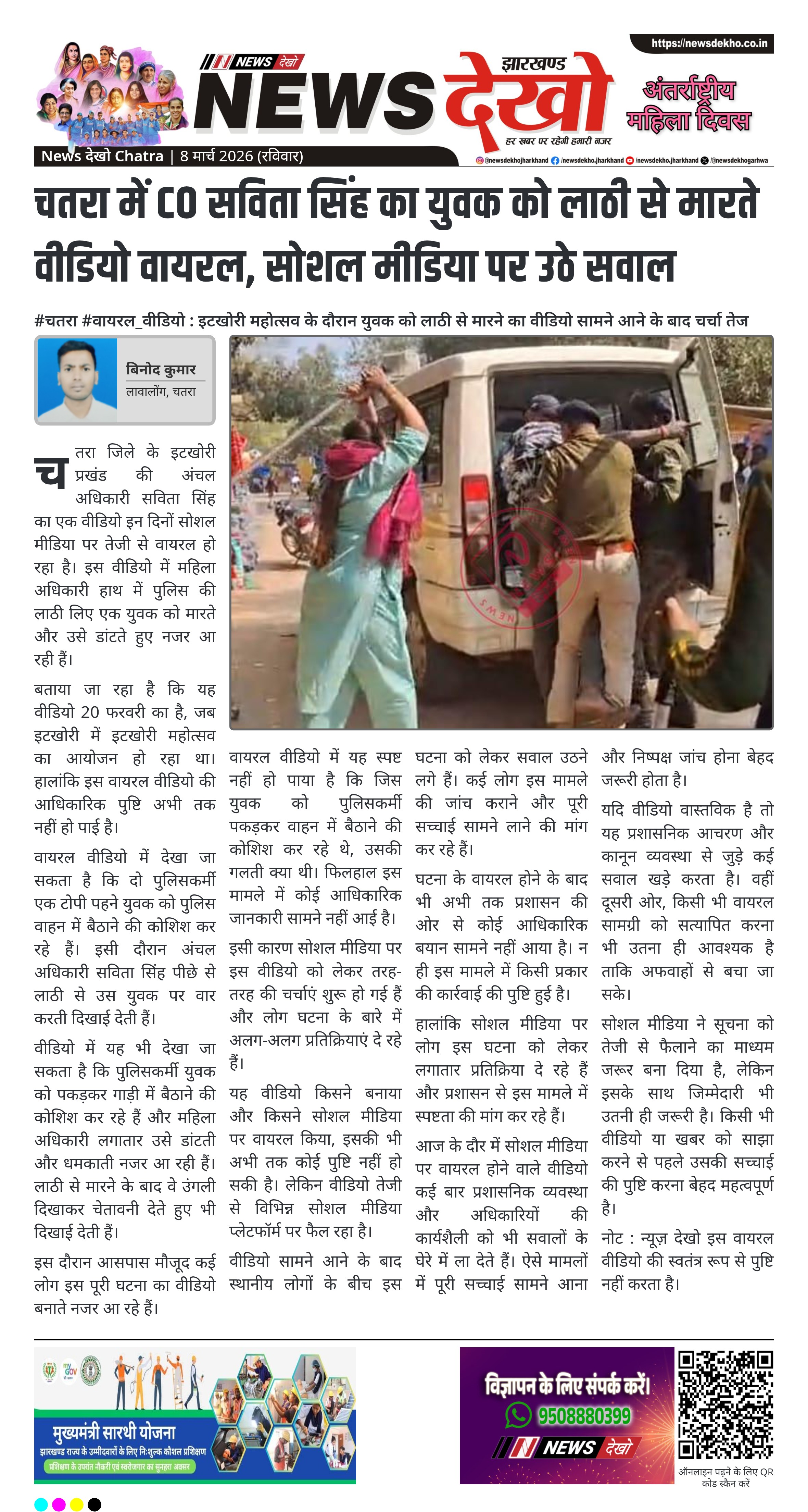 चतरा जिले के इटखोरी प्रखंड की अंचल अधिकारी सविता सिंह का एक वीडियो इन दिनों सोशल मीडिया पर तेजी से वायरल हो रहा है। इस वीडियो में महिला अधिकारी हाथ में पुलिस की लाठी लिए एक युवक को मारते और उसे डांटते हुए नजर आ रही हैं।