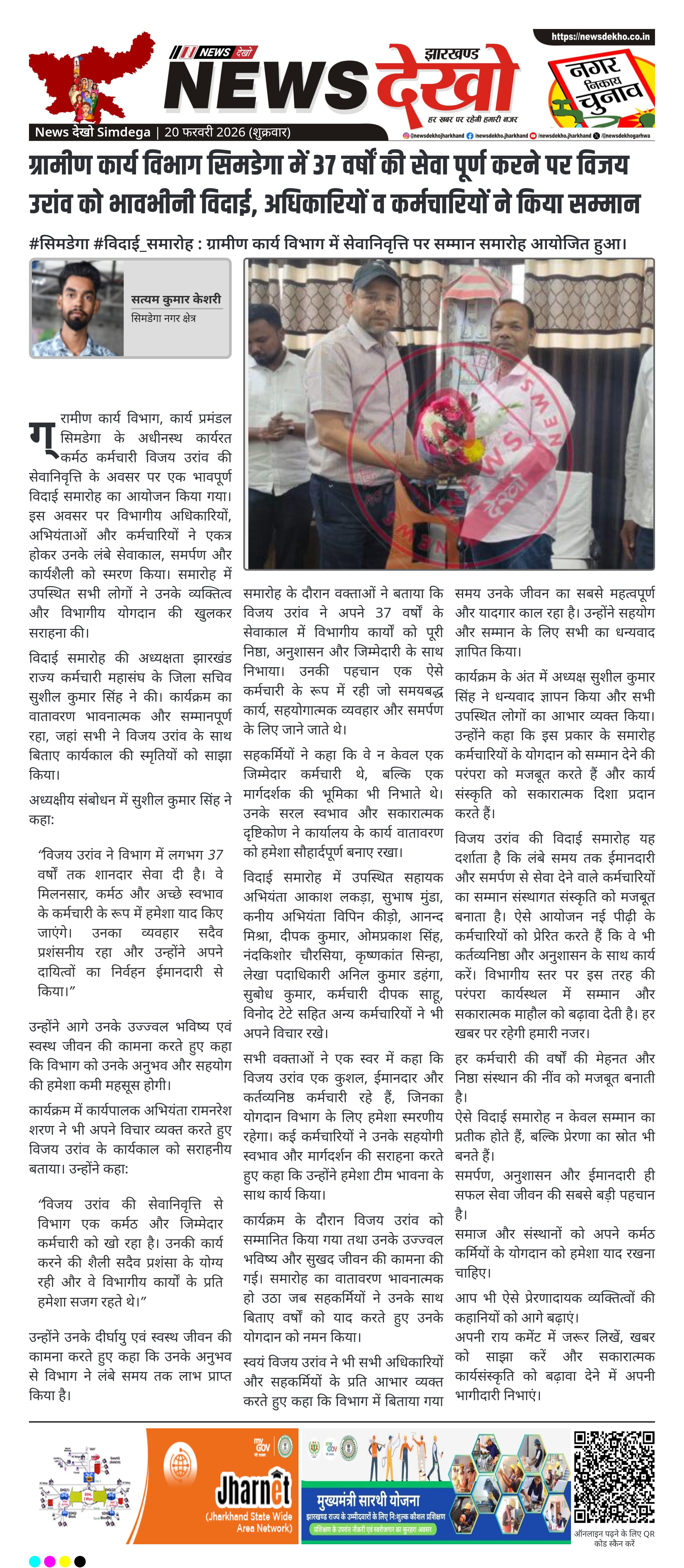 ग्रामीण कार्य विभाग, कार्य प्रमंडल सिमडेगा में कार्यरत विजय उरांव की सेवानिवृत्ति पर सम्मानपूर्वक विदाई समारोह आयोजित किया गया। समारोह की अध्यक्षता झारखंड राज्य कर्मचारी महासंघ के जिला सचिव सुशील कुमार सिंह ने की, जहां अधिकारियों और कर्मचारियों ने उनके 37 वर्षों की सेवा को सराहा। कार्यक्रम में उनके कर्मठ कार्यशैली, मिलनसार स्वभाव और विभागीय योगदान को विशेष रूप से याद किया गया।