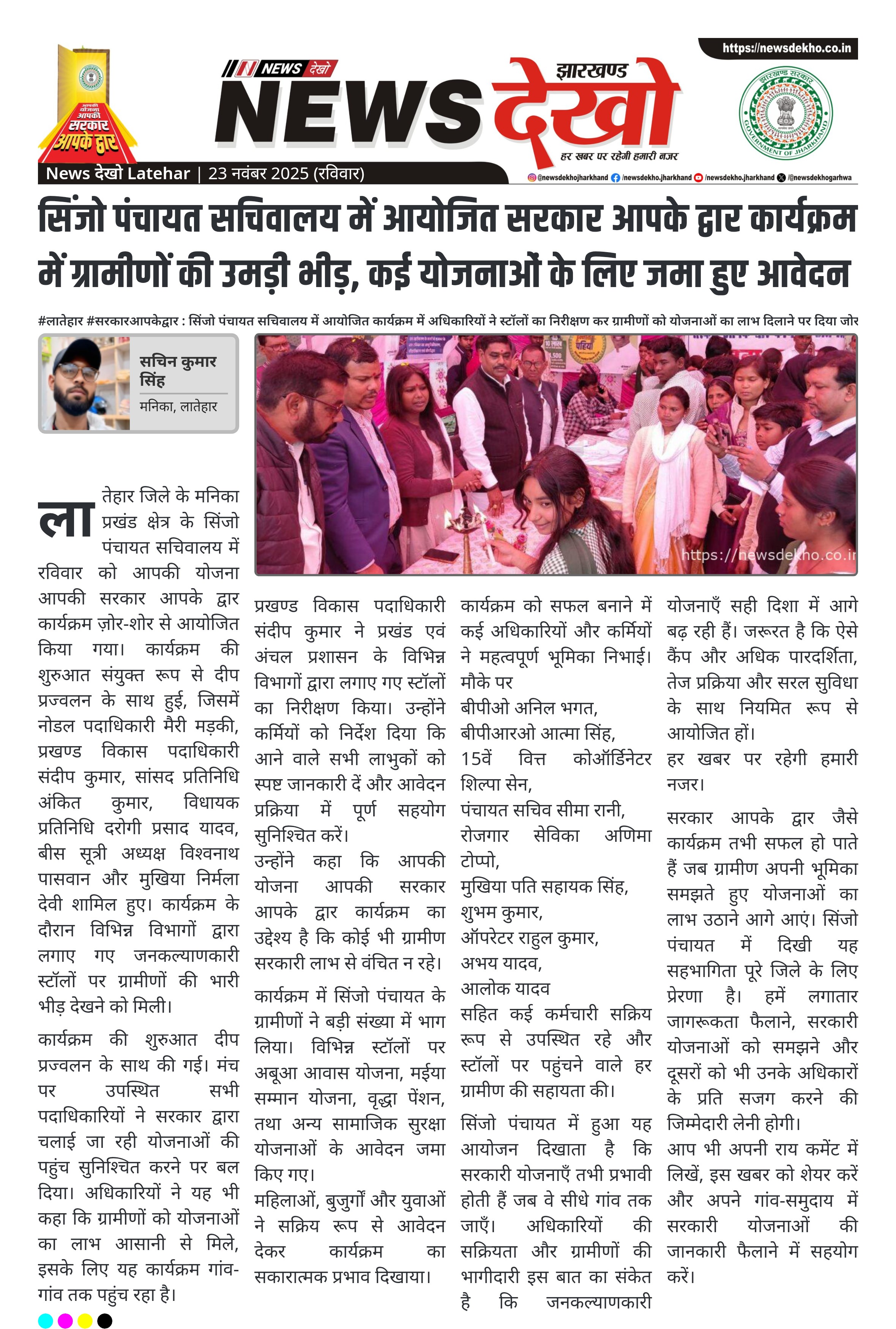 लातेहार जिले के मनिका प्रखंड क्षेत्र के सिंजो पंचायत सचिवालय में रविवार को आपकी योजना आपकी सरकार आपके द्वार कार्यक्रम ज़ोर-शोर से आयोजित किया गया। कार्यक्रम की शुरुआत संयुक्त रूप से दीप प्रज्वलन के साथ हुई, जिसमें नोडल पदाधिकारी मैरी मड़की, प्रखण्ड विकास पदाधिकारी संदीप कुमार, सांसद प्रतिनिधि अंकित कुमार, विधायक प्रतिनिधि दरोगी प्रसाद यादव, बीस सूत्री अध्यक्ष विश्वनाथ पासवान और मुखिया निर्मला देवी शामिल हुए। कार्यक्रम के दौरान विभिन्न विभागों द्वारा लगाए गए जनकल्याणकारी स्टॉलों पर ग्रामीणों की भारी भीड़ देखने को मिली।