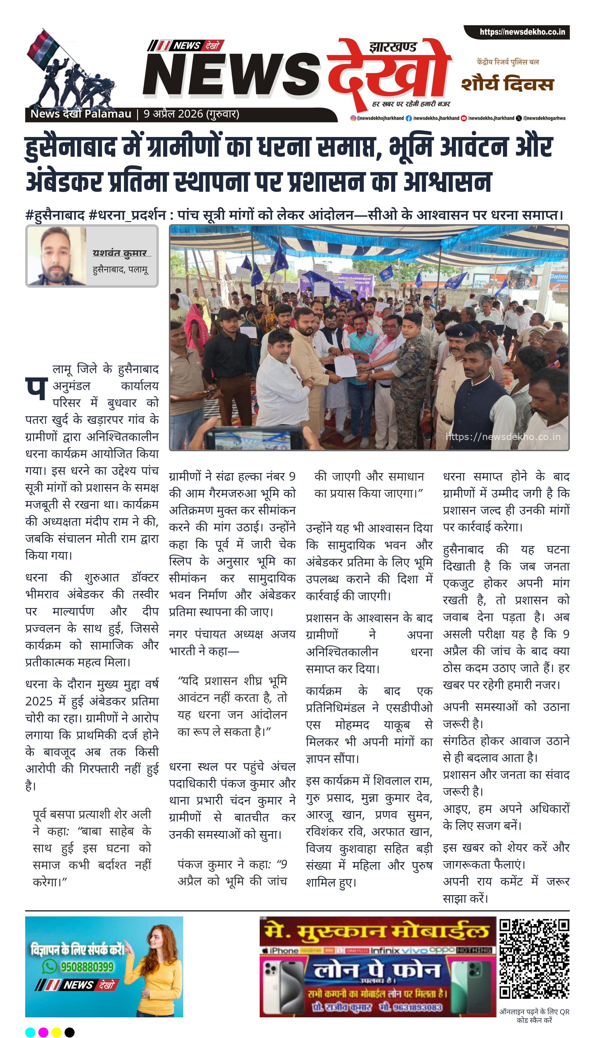 पलामू के हुसैनाबाद में पतरा खुर्द के ग्रामीणों ने भूमि और अंबेडकर प्रतिमा स्थापना को लेकर धरना दिया। प्रशासन के आश्वासन के बाद धरना समाप्त हुआ। अधिकारियों ने 9 अप्रैल को जांच कर समाधान का भरोसा दिया। कार्यक्रम में बड़ी संख्या में लोग शामिल हुए।