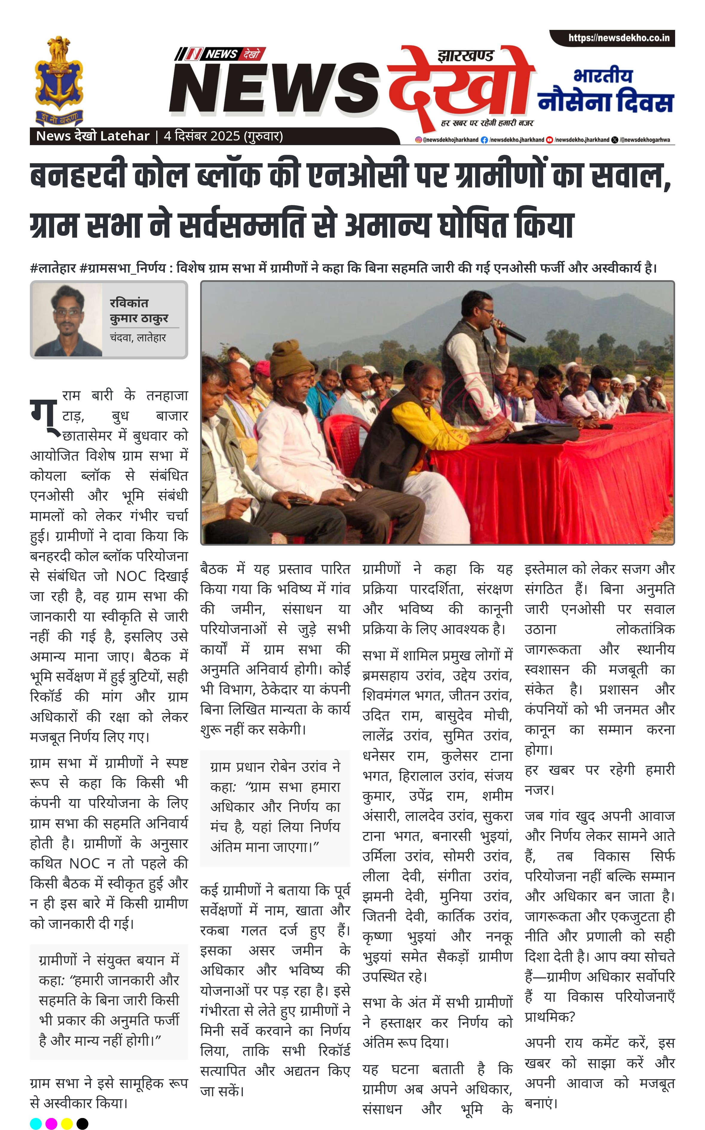ग्राम बारी के तनहाजा टाड़, बुध बाजार छातासेमर में बुधवार को आयोजित विशेष ग्राम सभा में कोयला ब्लॉक से संबंधित एनओसी और भूमि संबंधी मामलों को लेकर गंभीर चर्चा हुई। ग्रामीणों ने दावा किया कि बनहरदी कोल ब्लॉक परियोजना से संबंधित जो NOC दिखाई जा रही है, वह ग्राम सभा की जानकारी या स्वीकृति से जारी नहीं की गई है, इसलिए उसे अमान्य माना जाए। बैठक में भूमि सर्वेक्षण में हुई त्रुटियों, सही रिकॉर्ड की मांग और ग्राम अधिकारों की रक्षा को लेकर मजबूत निर्णय लिए गए।